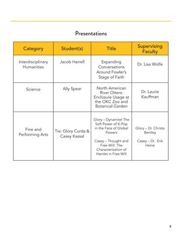 Thank you for taking the time to visit this spring 2022 edition of the Endeavor, the OCU Honors Program newsletter. After a brief delay returning to in-person classes in January, the spring semester has been full of activities and special events. We are so pleased to congratulate our 31 cum honore graduates whose profiles and pictures you’ll see in the pages ahead along with a feature on our graduation dinner and awards ceremony, held at a favorite local restaurant in OKC’s Plaza District, The Press. The semester also saw the return of in-person Undergraduate Research Day, featuring student posters and presentations in a variety of disciplines along with two performance pieces. Late spring is also the time that the honors student body elects its new Honors Student Council members. You can meet them too in this