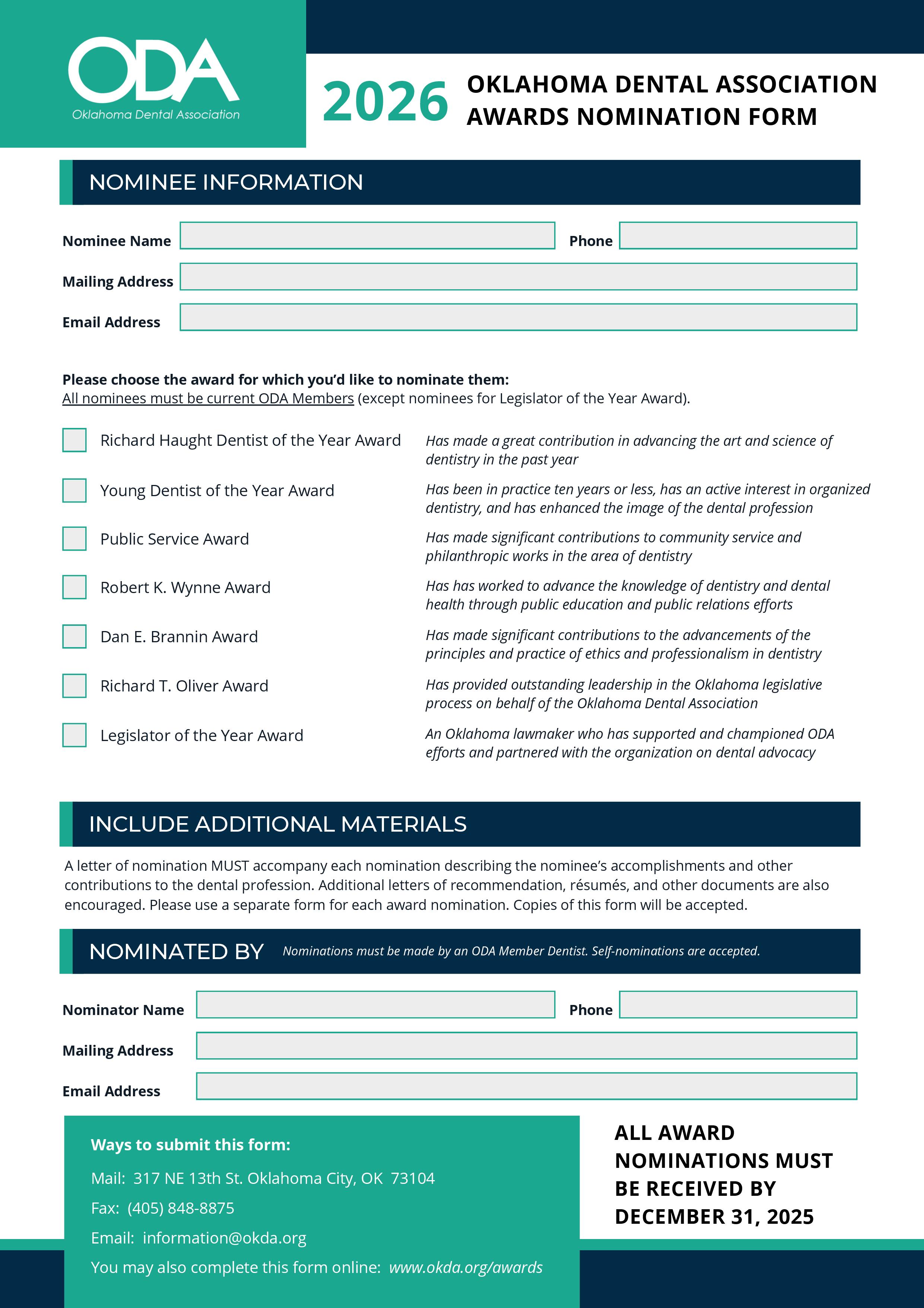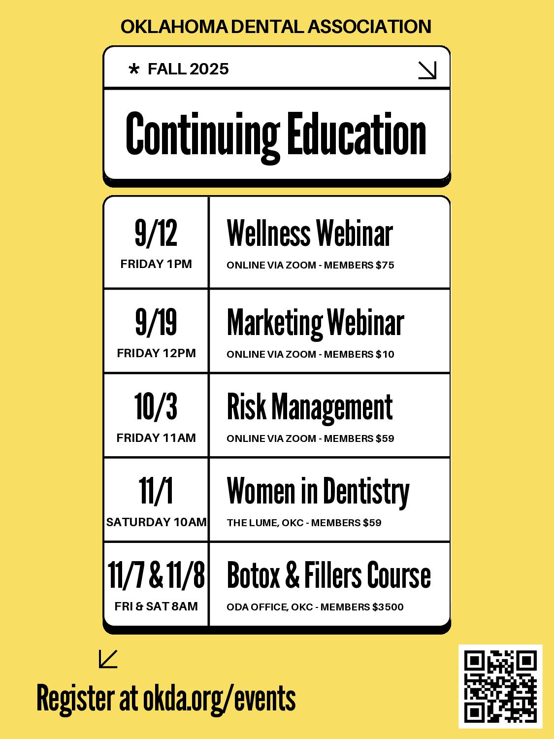 Help the ODA keep you informed about legislative actions, educational opportunities, events, and other important member-only news. Contact Ansley Jinkins at ajinkins@okda.org or 800.876.8890 to provide ODA with your current contact information.