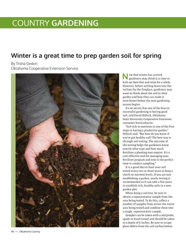 Winter is a great time to prep garden soil for spring By Trisha Gedon Oklahoma Cooperative Extension Service ow that winter has arrived, gardeners may think it is time to kick up their feet and relax for a while. However, before settling down into the recliner by the fireplace, gardeners may want to think about the soil in their garden and how they can make it even better before the next gardening season begins. It’s no secret that one of the keys to successful gardening is having good soil, said David Hillock, Oklahoma State University Cooperative Extension consumer horticulturist. “Soil rich in nutrients is one of the first steps to having a productive garden,” Hillock said. “But how do you know if you’ve got healthy soil? The best way is through soil testing. The outcome of the testing helps the gardeners know exactly what type and how much fertilizer a planting may require. It’s a cost-effective tool for managing your fertilizer program and now is the perfect time to conduct sampling.” It is a good idea to have your soil tested every two or three years to keep a check on nutrient levels. If you are just establishing a garden, yearly testing is recommended as it can take a few years to establish rich, healthy soils in a new garden plot. When doing a soil test, be sure to obtain a representative sample from the area being tested. To do this, collect a number of samples from across the entire area being tested and combine them into a single, representative sample. Samples can be taken with a soil probe, spade or hand trowel and should be taken to a depth of 6 inches. Be sure to scrape plant debris from the soil surface before 46 — Oklahoma Country