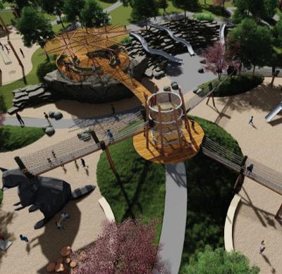 park with splash pads, a 13-acre wooded hiking area, and a stocked pond for fishing. Most enticing to Edmond’s families will be the 3.5-acre playground made of organic materials and featuring climbable art. “Our mission is to connect people of all ages to the virtues of art, nature and play,” said Pepper.