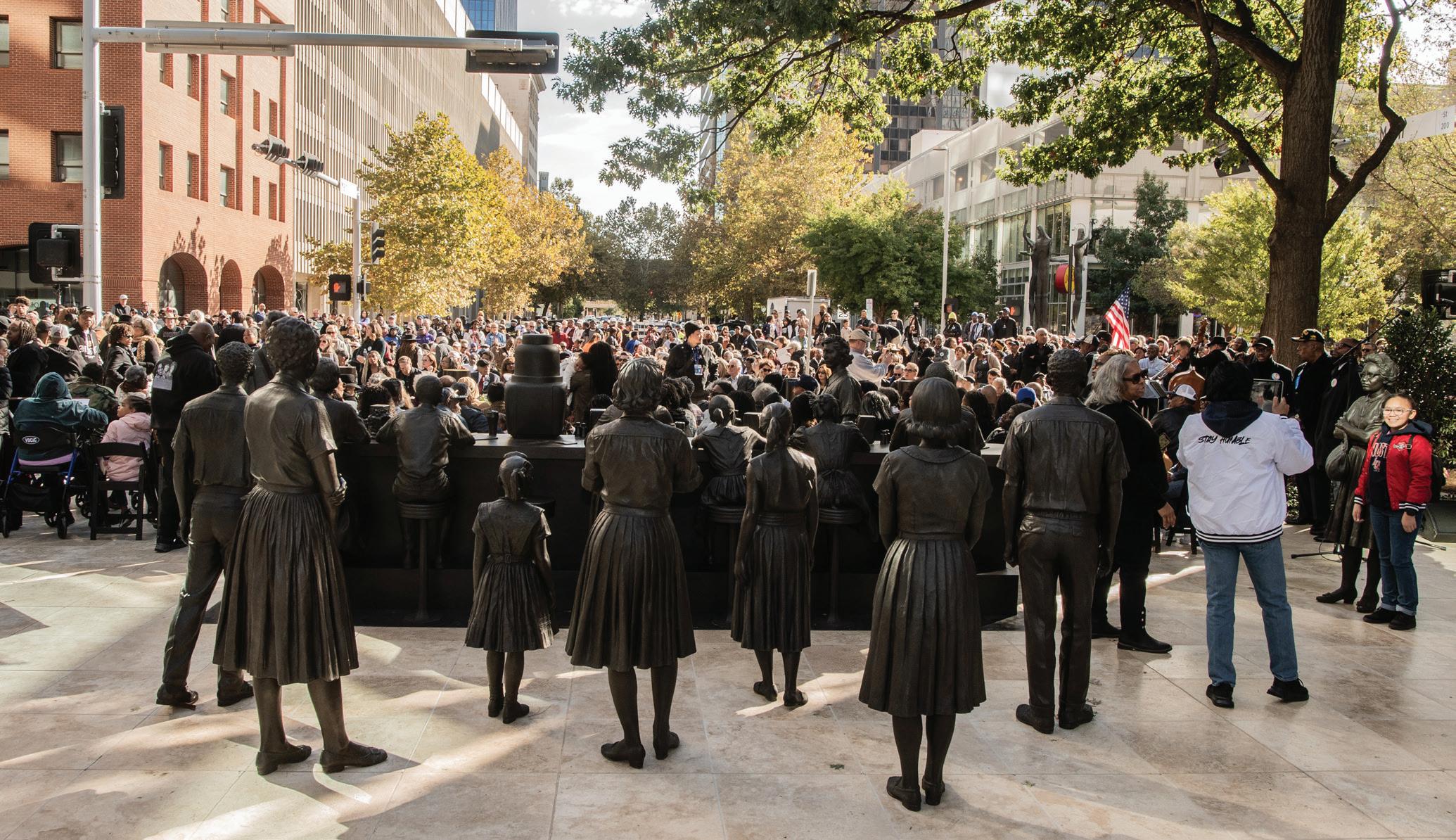 On Saturday Nov. 1, nearly 1,000 Oklahomans and visitors stood in the sunny intersection of W. Main St. and N. Robinson Ave. as Hildreth gave the final speech in the ceremony honoring the legacy of her mother. In the hour prior, attendees heard speeches from former Oklahoma Secretary of State John Kennedy, councilmember Rev. Lee Cooper, Studio EIS and Mayor David Holt, among others. Interspersed throughout the program were performances by Spencer Elementary, Dunjee Alumni, and Langston University choirs, as well as a spoken word piece by Tinasha LaRayé and group singing led by Joyce Henderson. The bronze scene, which took seven years to make, is the first formal recognition of the historic sit-in by the city.