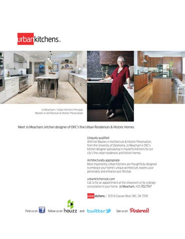 Meet Jo Meacham, kitchen designer of OKC’s fine Urban Residences & Historic Homes Uniquely qualified With her Masters in Architecture & Historic Preservation, from the University of Oklahoma, Jo Meacham is OKC’s kitchen designer specializing in masterful kitchens for our city’s fine urban residences and historic homes. Architecturally appropriate Most importantly, Urban Kitchens are thoughtfully designed to embrace your home’s unique architecture, express your personality and enhance your lifestyle. urbankitchensok.com Call Jo for an appointment at the showroom or for a design consultation in your home. Jo Meacham, 405.702.7747 urban kitchens / 3515 N Classen Blvd. OKC, OK 73118