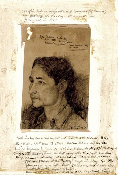 Throughout his life, Echohawk would be inspired by the Pawnee tradition to tell and draw of battle. He wrote articles for the Tulsa World in 1955 and 1967 to educate the next generation of the sacrifices and horrors of war. Echohawk’s humor and awareness of the power of images can be seen in his caption for the Lachhiman image in his 1955 article “Another Indian! But this one is a Gurkha from northeast India.”17 In the 1967 article he wrote how he held on to his childhood memories of Oklahoma to stay sane during the hellish German bombardment: “88s gut the earth. I think of anything to keep from cracking: high school football, the Pawnee pow-wow, stomp dances, Bob