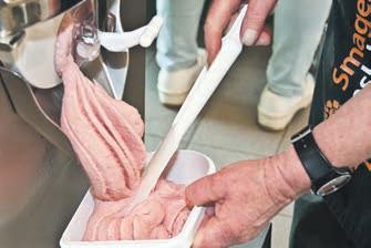 Det ser forførende fristende ud, når den friskfrosne ismasse slanger sig ud af ismaskiner i gårdmejeriet på Ny Lundgård, og smagsløgene hos avisens udsendte bliver ikke skuffede