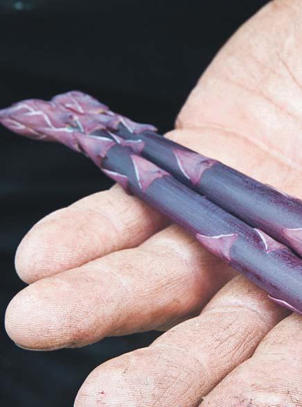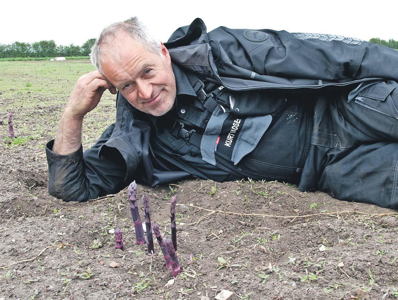 De første planter er blevet 14 år, og leverer i år deres sidste høst, inden de store rodkager med en diamater på op til 180 cm bliver pløjet op, så nye planter kan tage over, forklarer Kurt Madsen og ’høster’ et par friske røde asparges med to sprøde knæk.