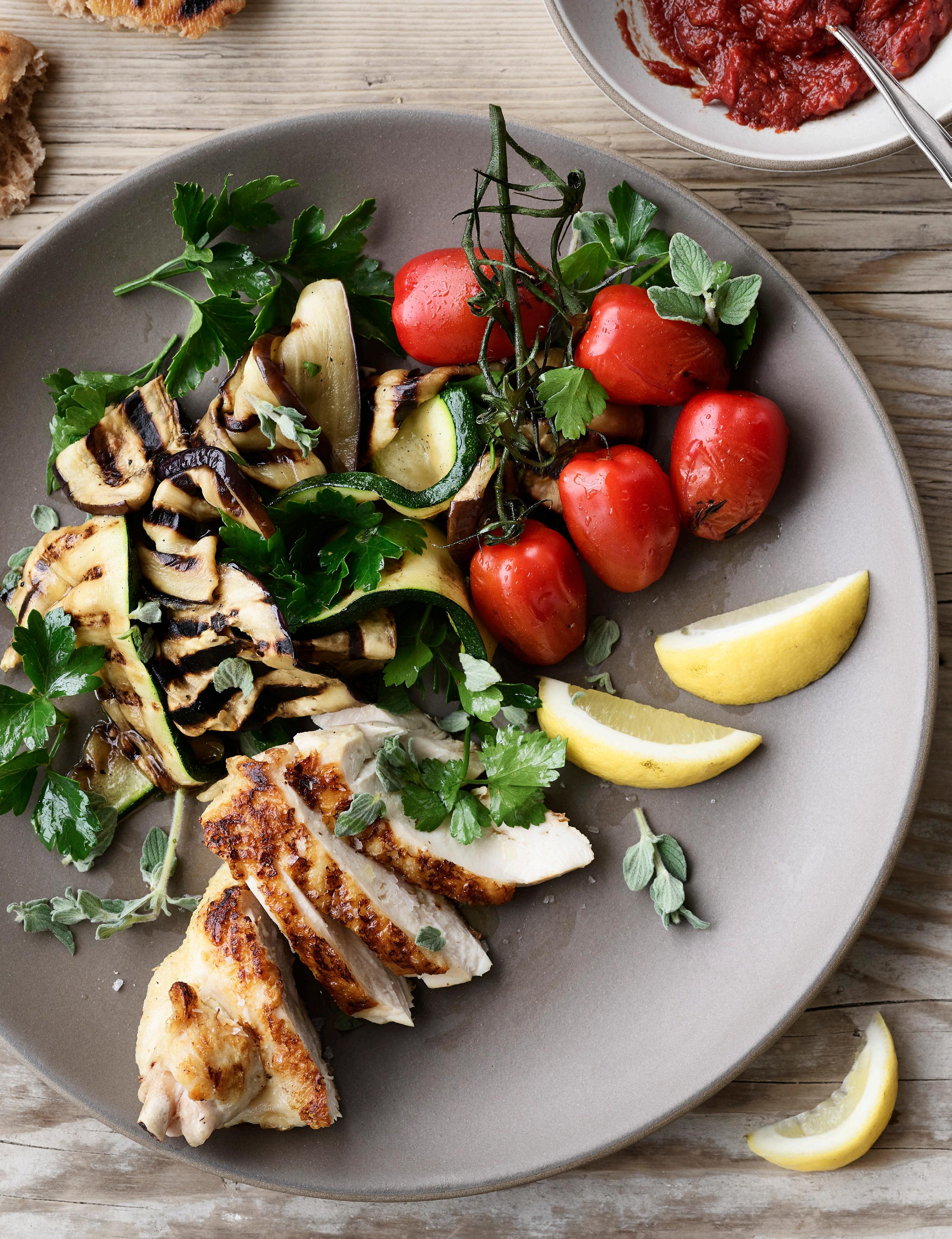 24 Sommermenu: Grillet grønt/kylling, jordbærsalat og bærdessert