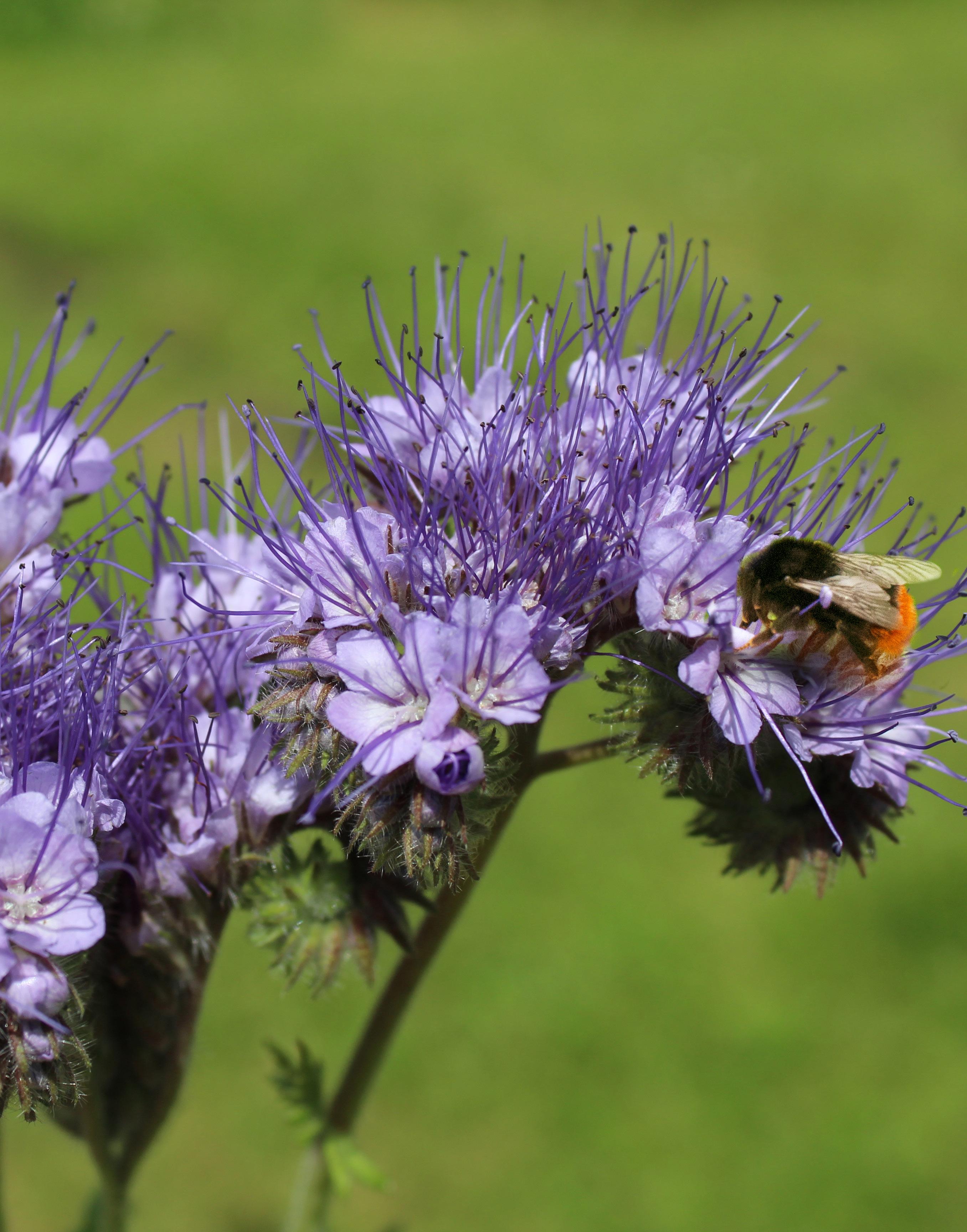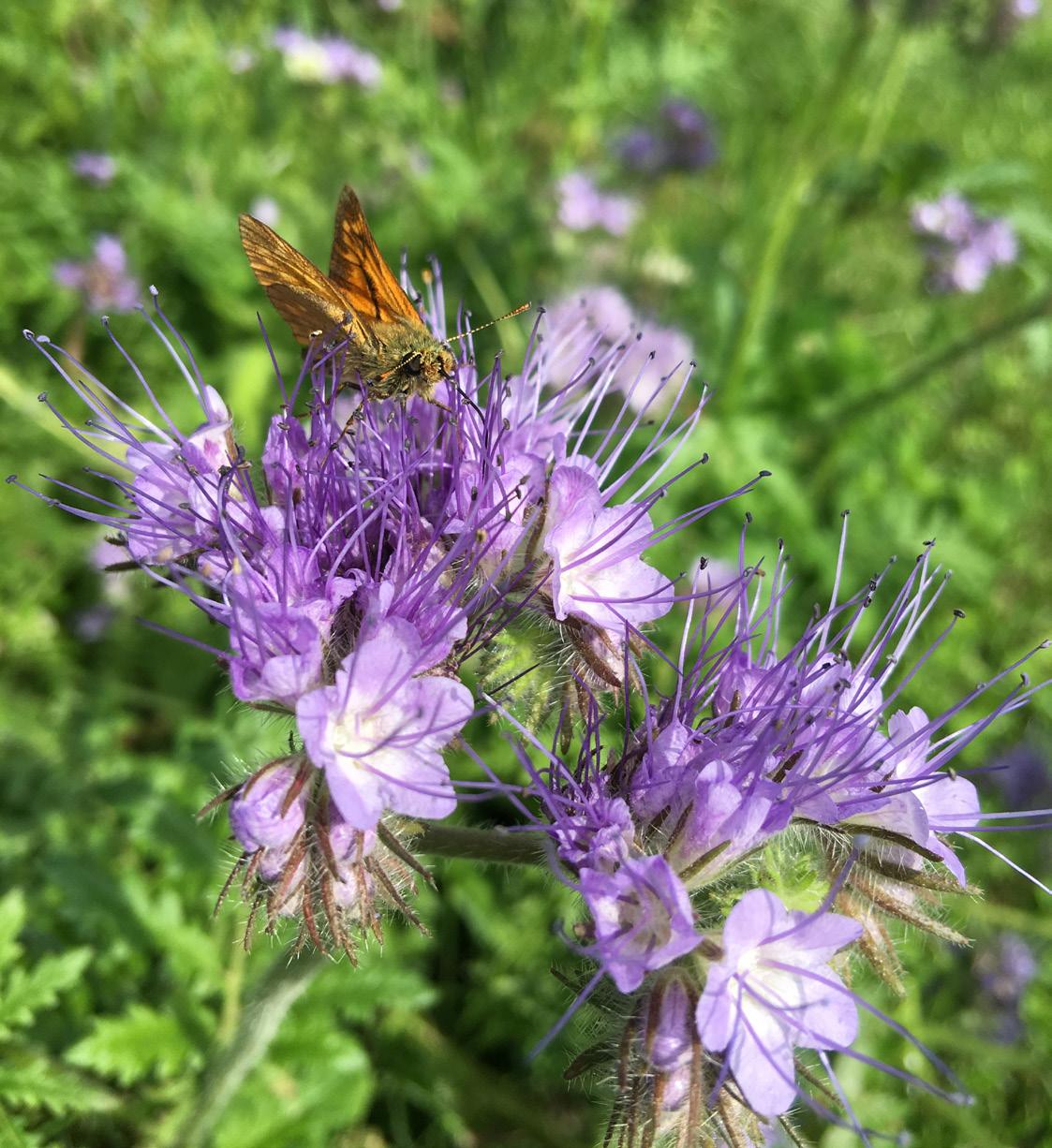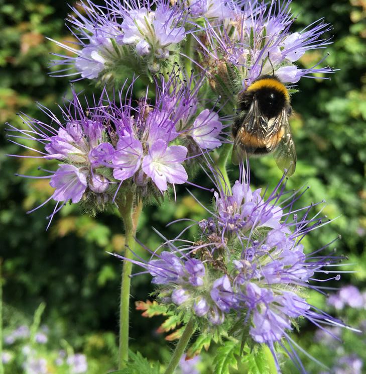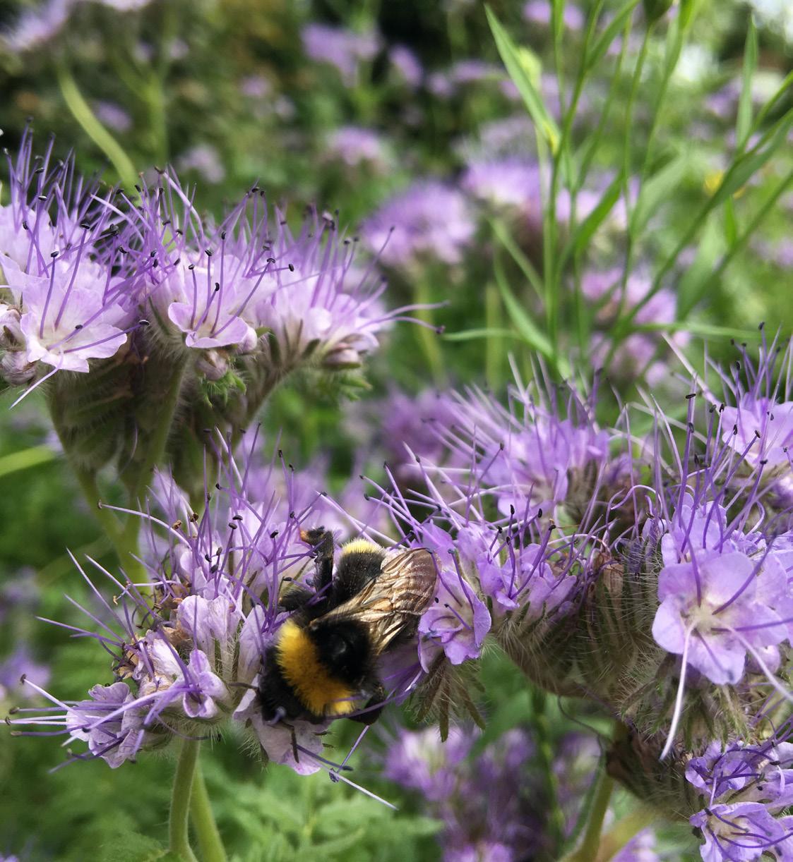 Honningurt er blandt de første ansigter i frømikset, der blomstrer. Her midt i juni hos Shona og Pieter strækker de lilla blomster endelig hals mod himlen efter en knastør april og en råkold maj. Engang i oktober slutter morgenfruerne frømiksets farvefest af. Med frømikset får bestøverne sig altså en rig nektar- og pollen-buffet hen over hele sommeren.