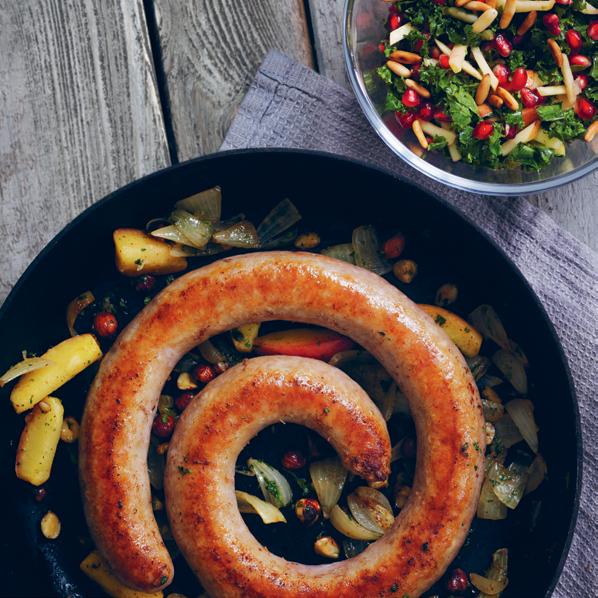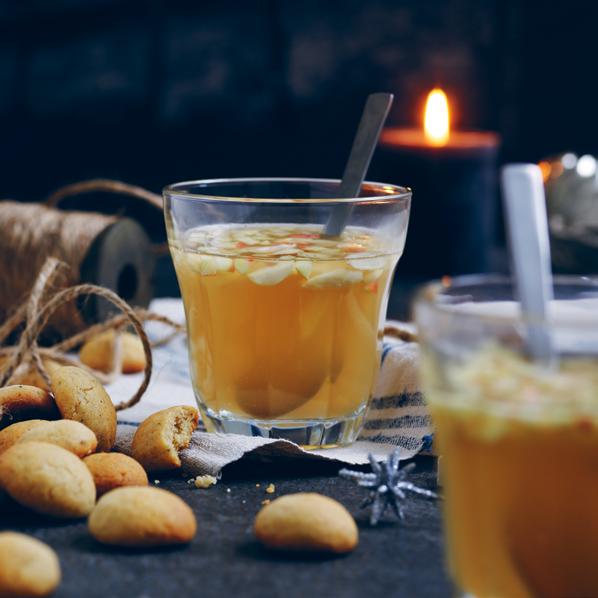 æblegløgg med ingefær. Sprød og sund grønkålssalat. Saftig medisterpølse.