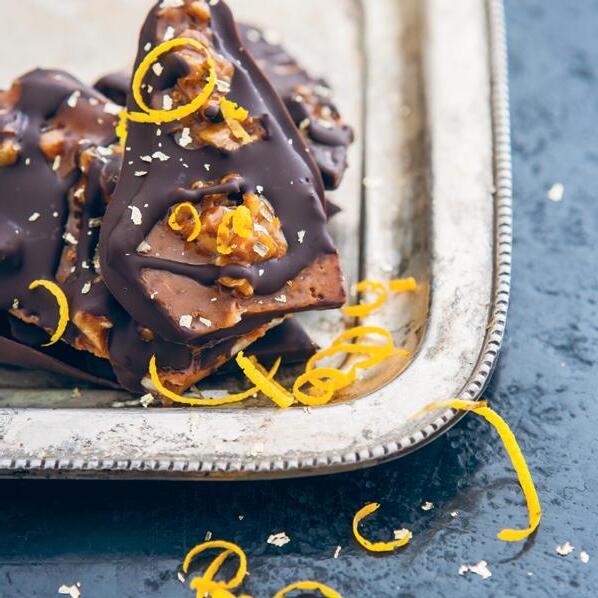Hæld derefter karamelmassen ud på bagepapir og lad det stivne og blive helt koldt. Bræk derefter chokoladen i stykker og smelt den over et vandbad.