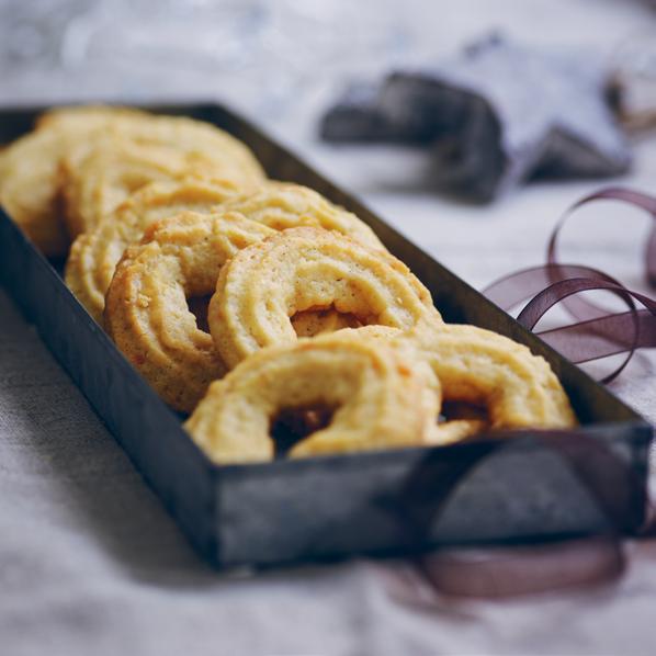 Tænd ovnen på 200°C. Kør dejen gennem en kødhakker monteret med stjerneformet kageplade. Skær pølserne ud i 10 cm lange stykker og form dem til små kranse. Læg kransene på en bageplade med bagepapir. Bag kransene øverst i ovnen i 7-8 minutter, til de er let gyldne.