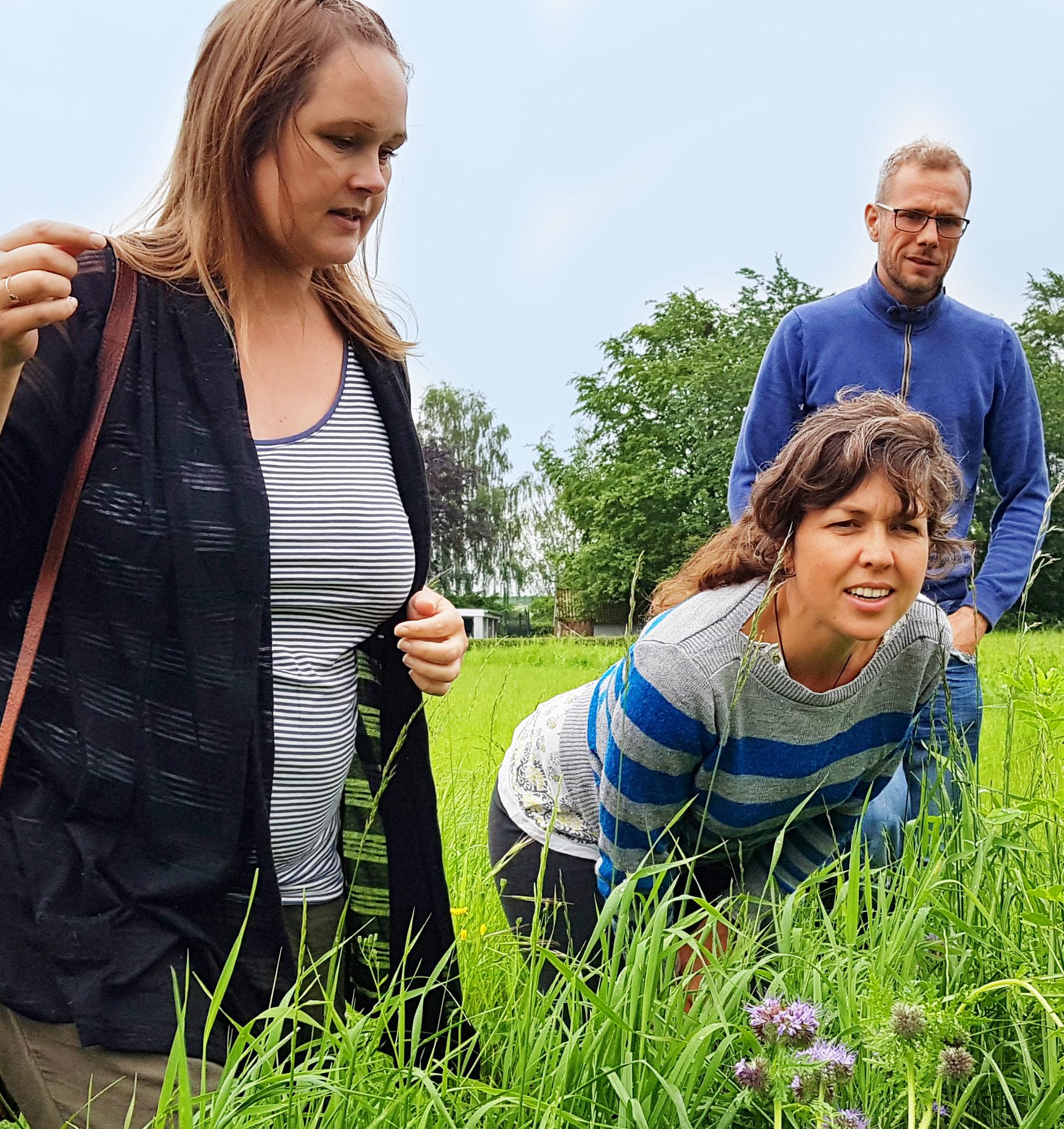 Julie Rohde Birk (tv.) forklarer Shona og Pieter, at honningurten på billedet er god til at tiltrække insekt-generalister som stenhumler.