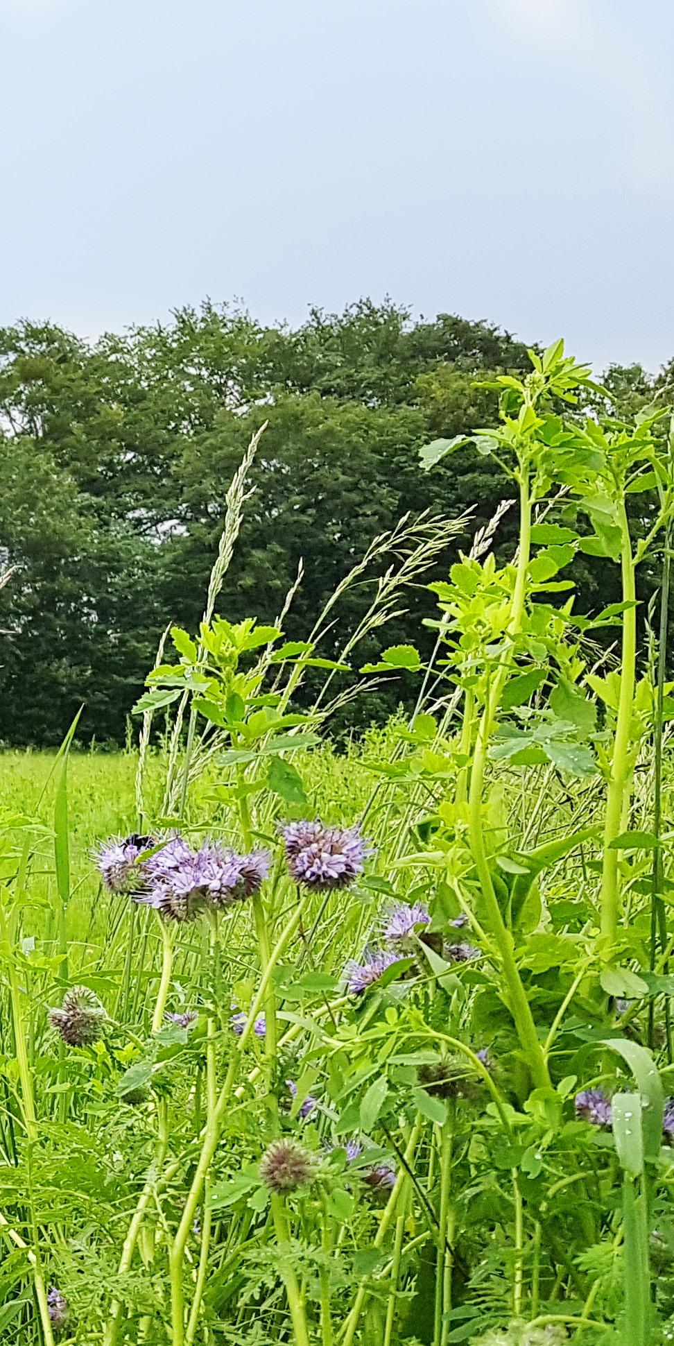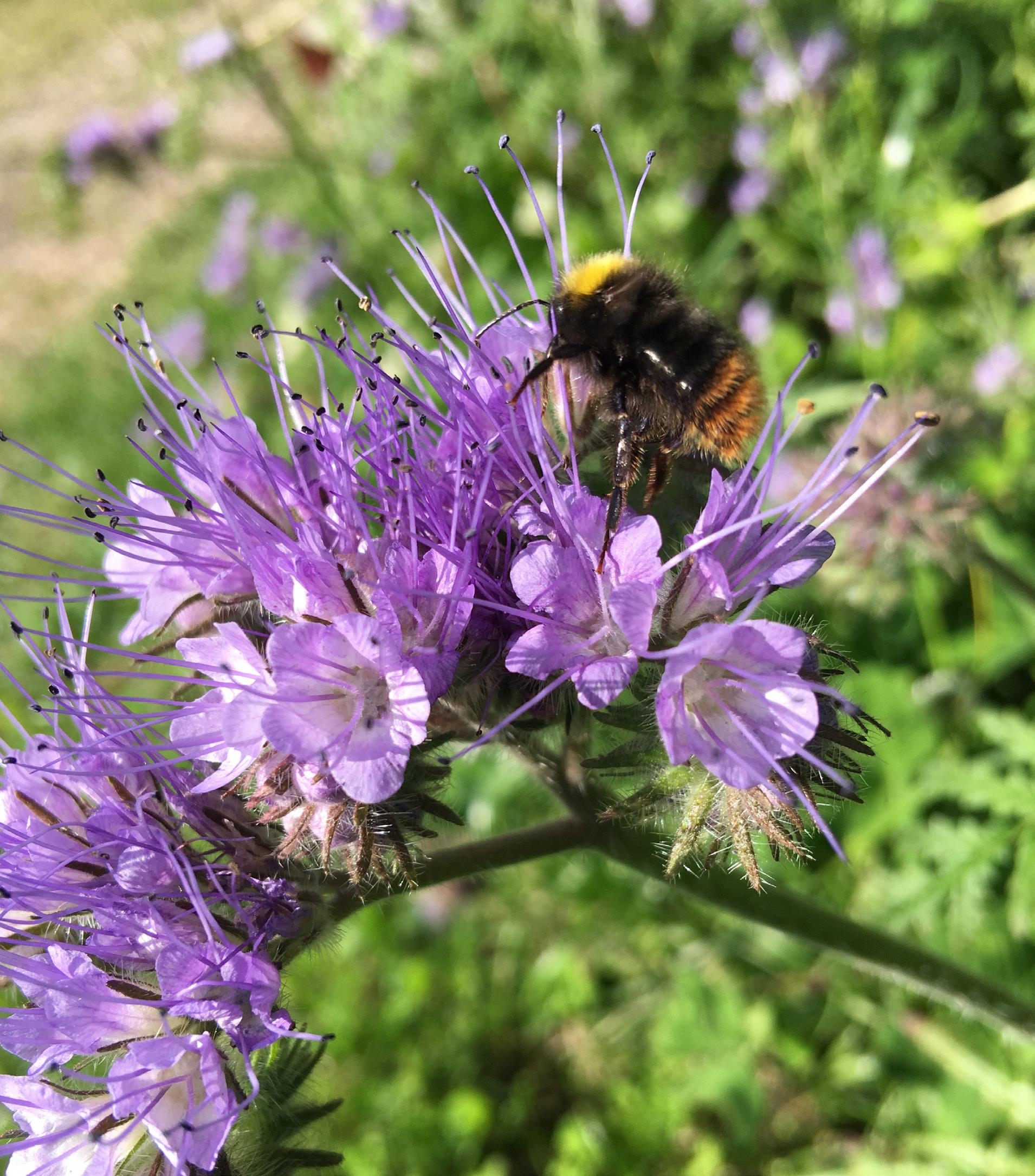 Hos Shona og Pieter så jeg, at store dele af ejendommen uden for blomsterstriberne er sået til med en blanding af græs og hvidkløver, der stod i blomst. Hvidkløver er rigtig god mad til generalisterne blandt bierne. Den er også vidt udbredt i det sædskifte, økologerne praktiserer i deres markdrift. Hvidkløver er som andre bælgplanter god til