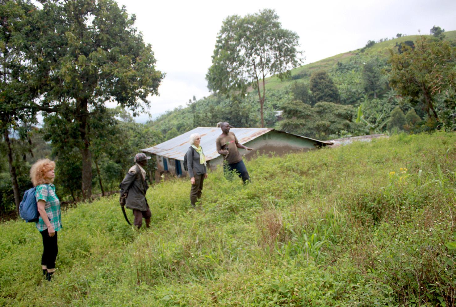 Christina Due (tv.) og Kirsten Marie Sørensen i felten i Vest-uganda. Småbønderne Justus og Josphine dyrker deres øko-landbrug på bjergskråningerne og har visioner om en bedre fremtid med flere køer på marken.