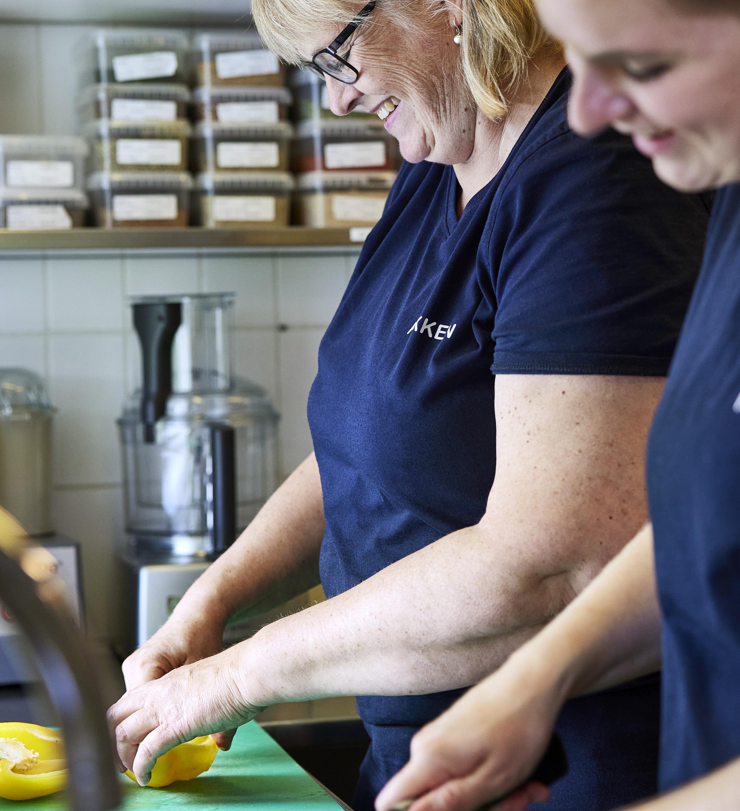 Før Karin Munkholm (tv.) overtog ledelsen af køkknet på Skrødstrup Efterskole, blev måltiderne lavet af færdigvarer fra frost. Nu laver de tre i køkkenet retterne fra bunden. Og det booster deres arbejdsglæde.