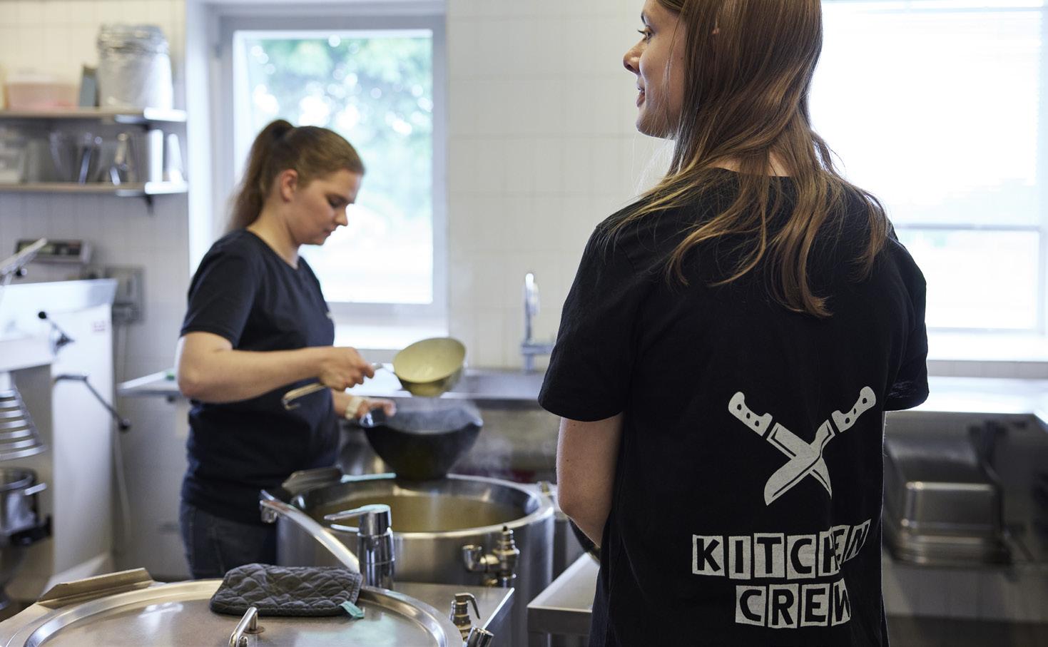De er medhjælpere i køkkenet på Skrødstrup Efterskole i et landområde syd for Mariager Fjord. Deres snak indfanger meget fint ånden i køkkenet.
