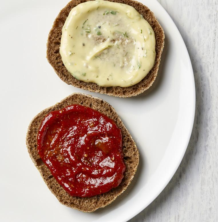 Kom krydder-mayo på underbollen og barbecuesauce på låget som vist her.