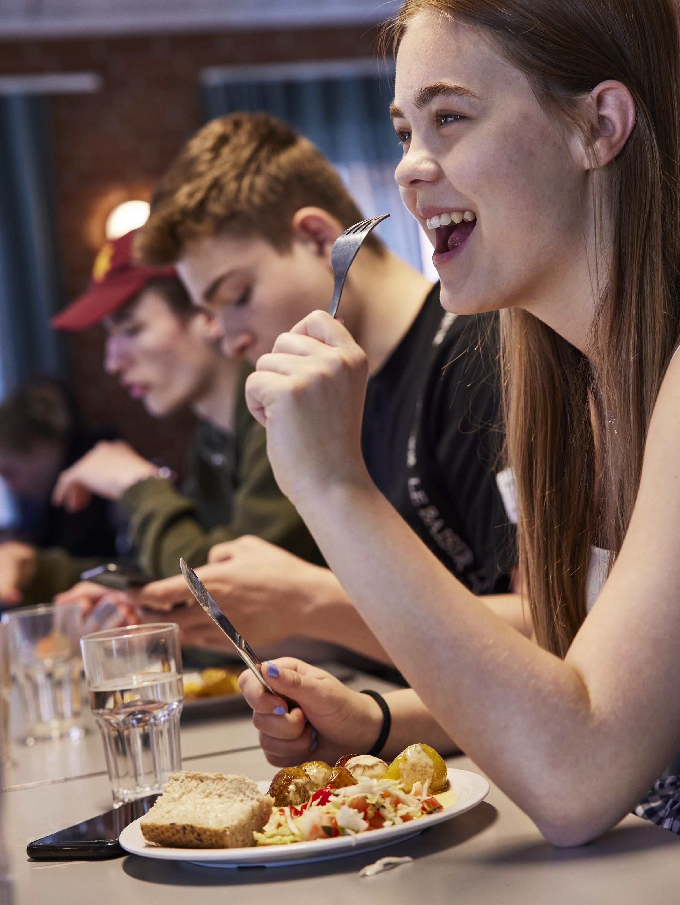 Vi har mange elever her fra Vestjylland, som er vant til sovs og kartofler. Vi holder af dem –men vi skubber også lidt til dem. Vi har blandt andet indført en kødfri ret en gang om ugen. Det er i sig selv nyt for en del af vores elever. Lige til at begynde med var nogle af dem lidt opstemte. Så sagde vi: Ja, du fik kød i går. Og du får det igen i morgen. Men prøv at smag på det her – det smager altså også godt!