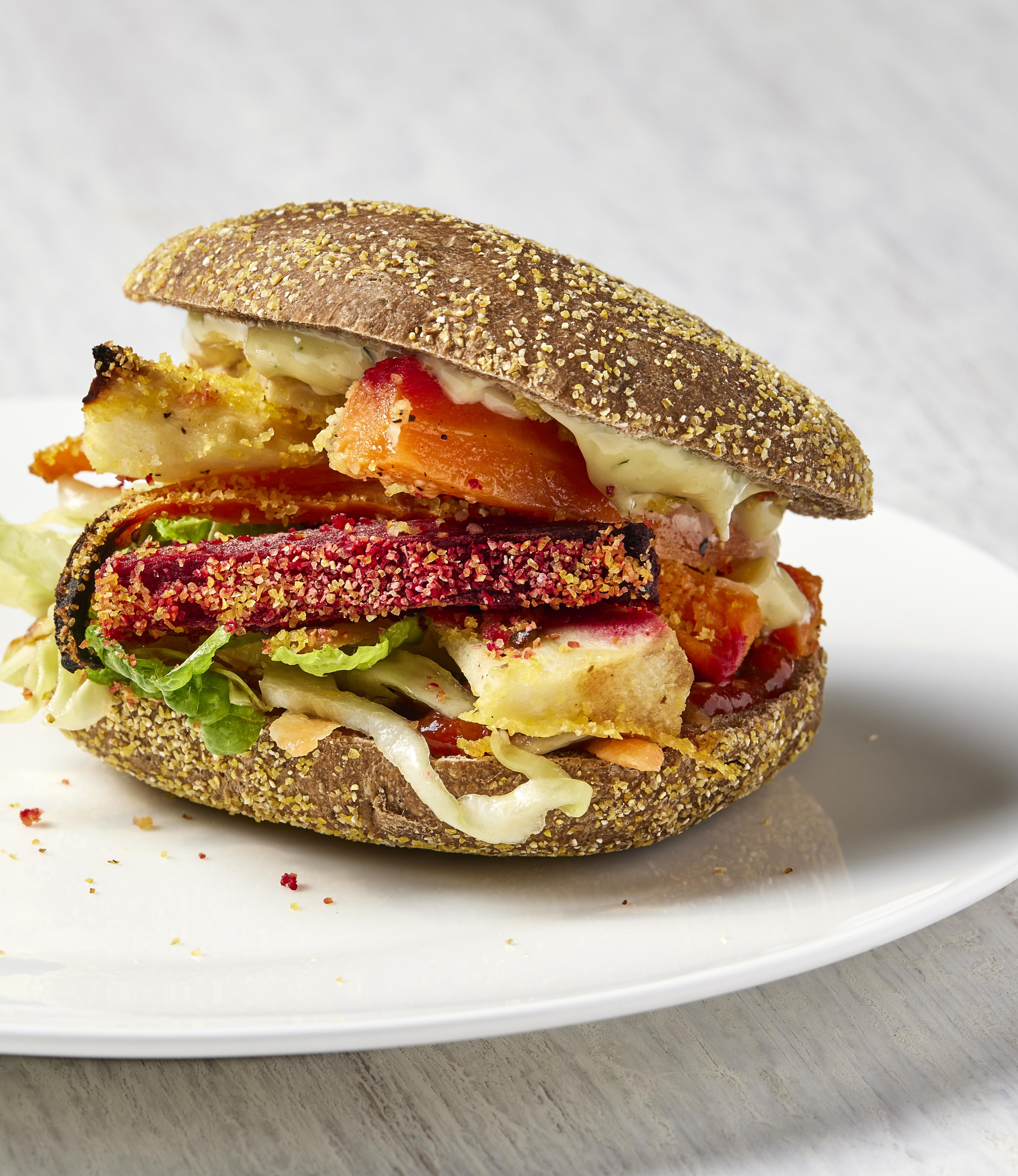 Skær rodfrugterne ud i stave i samme længde som burgerbollen. Vend rodfrugterne sammen med olie, salt og peber. Hvis du har rødbeder med i dit mix, skal du vende dem med olie og krydderier i en beholder for sig. Rodfrugterne fordeles i ét lag i en gastrobakke. Hvis I har rødbeder med, placereres disse øverst, når I ikke skal røre mere rundt i rodfrugterne. Drys majsmel ud over rodfrugterne i et fint lag. Bag rodfrugterne i cirka 30 minutter på 210 grader til de er møre og sprøde.