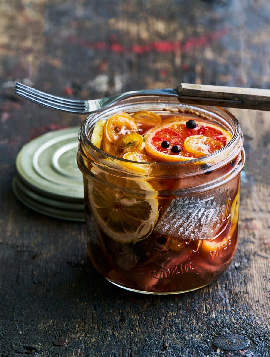 Skær kumquats, appelsin og citron i skiver. Kom dem i den varme lage, og kog i 1-2 minutter. Tag lagen af varmen, og køl den helt ned i køleskabet.