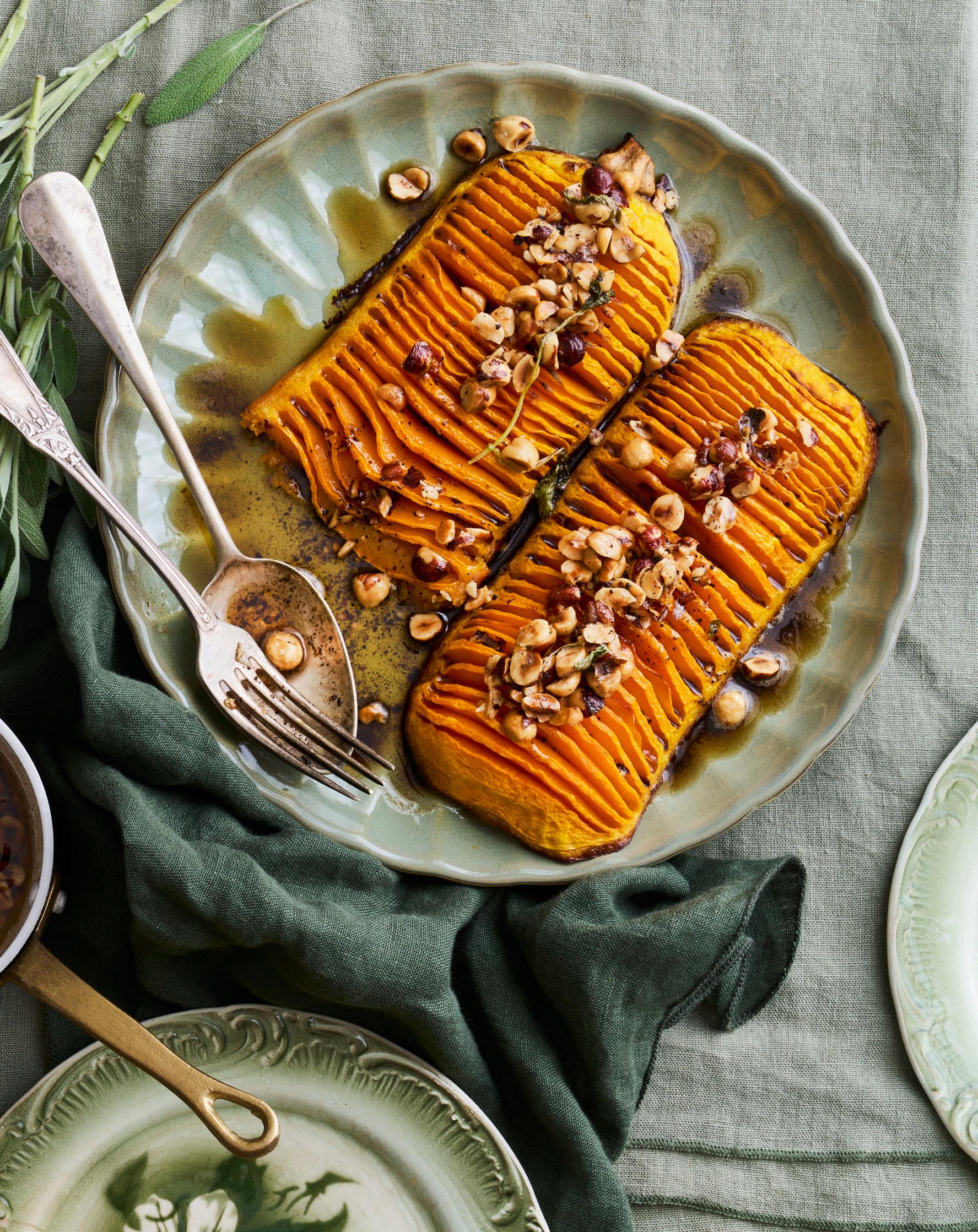 Tænd ovnen på 180 grader. Flæk butternutten på langs, og skrab kernerne ud med en ske. Skræl de to halvdele, læg dem med skærefladen nedad på et bræt, og skær tynde snit i græskarret. Pas på ikke at skære hele vejen igennem.