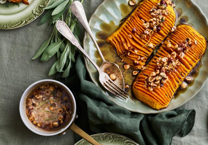 Læg evt. græskarret mellem to smørebrætter, når du snitter i den – så du ikke skærer helt igennem. Husk, at græskar kan være ret fadt, så salt grundigt, og smag evt. det brunede smør til med en smule citronsaft.