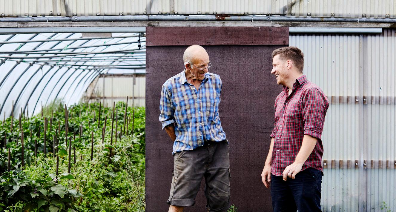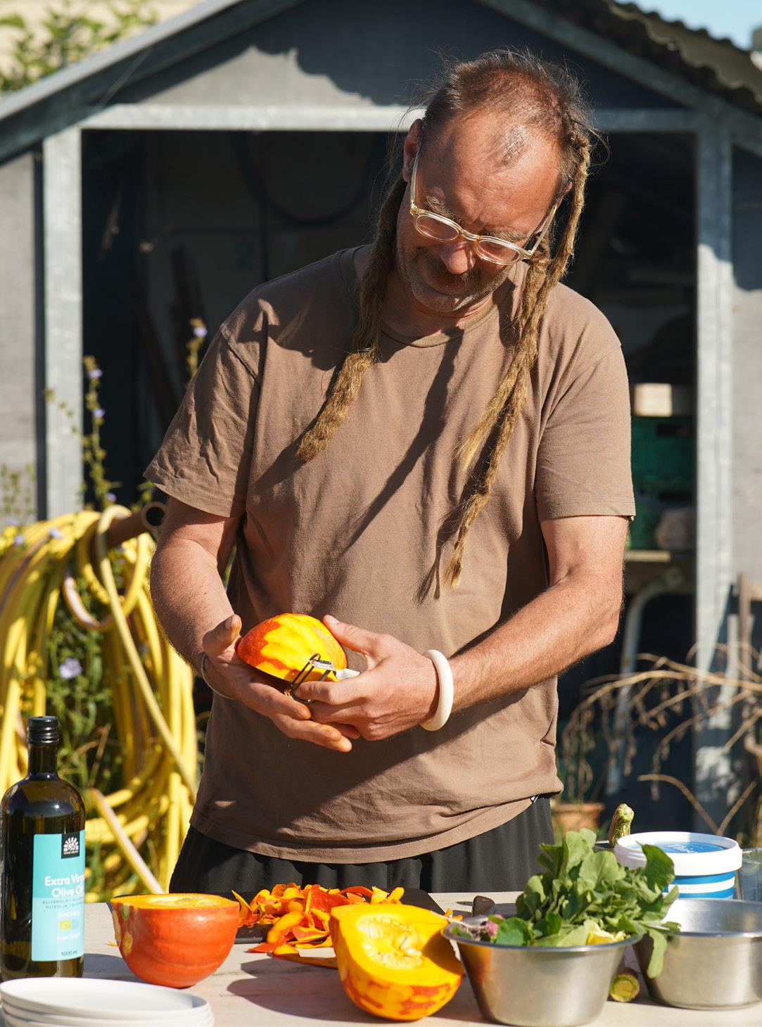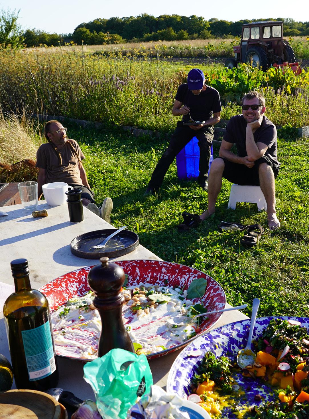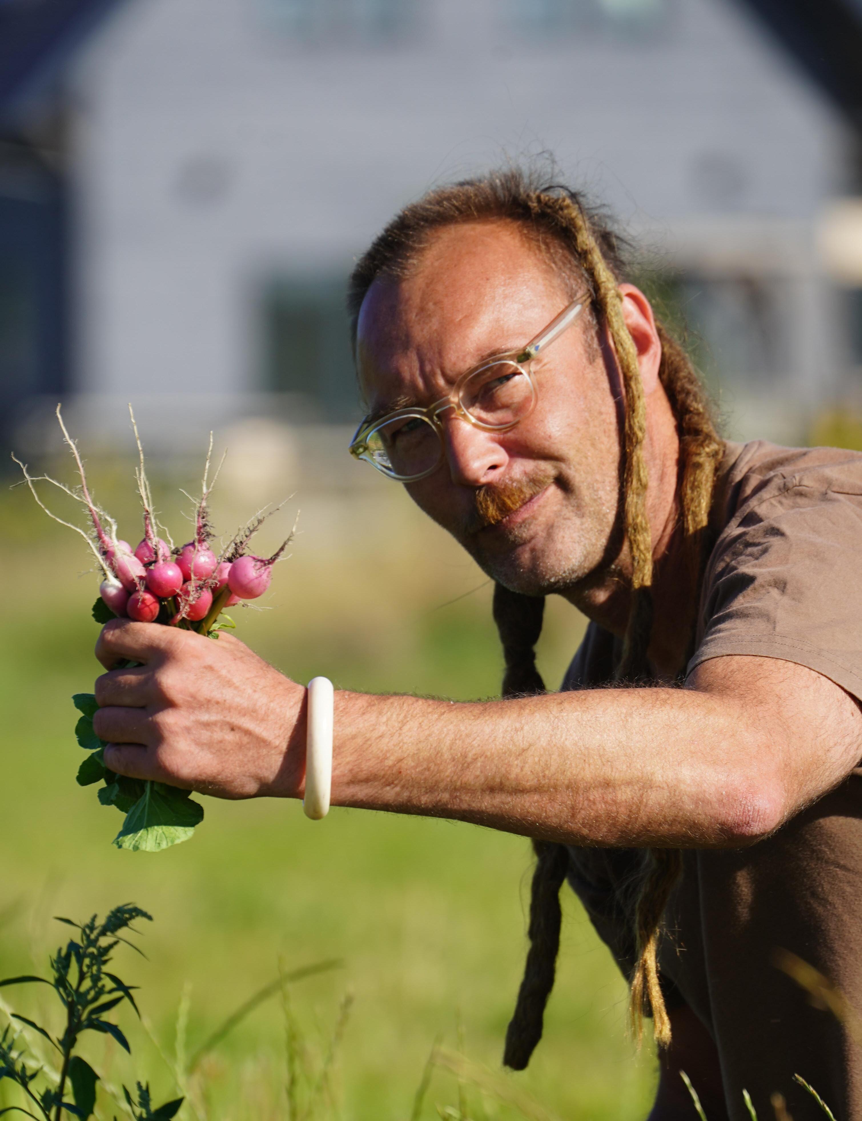 Den berejste kok og madformidler, som du måske kender fra DR-programmet Nak & Æd, er ved at svare på, hvorfor han har valgt at placere sit transportable køkkenbord og lagt knive, skærebrætter, fade og basisvarer på bordet lige præcis her. Bordet står i et farverigt hjørne af Neel Seerup Hansens økologisk-drevne ejendom. Vi er på Seerupgaard nær Dragør på Amager – et lille brug på seks hektar med en stor væksttunnel, kålmarker og højbede med krydderurter.