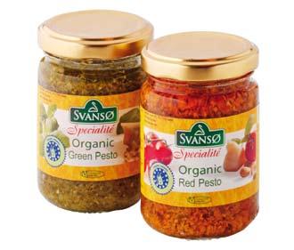 For få år siden var pesto et eksotisk indslag i de danske køkkener. Sådan er det ikke længere. Nu bruger vi den til frokost som smørelse i gourmet-sandwicher med parmaskinke og frisk rucola, og vi spicer pastaen op med den til aftenmåltidet. Svansø giver os nu mulighed for at gøre det med to økologiske pesto-varianter. Den røde er med soltørrede tomater, mens den grønne bl.a. er lavet på økologisk Parmigiano-ost. Svansø økologisk pesto fås i glas á 130 gram i de fleste dagligvarebutikker. Pris: 29,95 kr.
