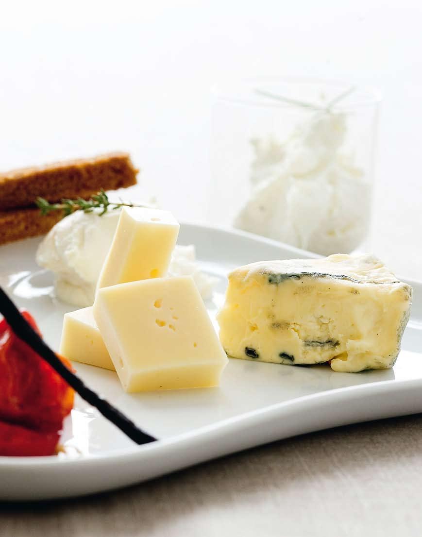 Fast modnet ost, fx Thy45+ fra Osteriet Hinge. Prisen i gårdmejeriet er 95 kr. pr. kilo. Se www.osteriet-hinge.dk. tilbehør: Bær, evt. med rørsukker.