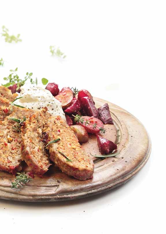Grøntsagerne og æblet skæres i meget fine tern og æltes i farsen sammen med salt og peber. Tilsæt havregryn og æg, ét efter ét. Skal have konsistens som fast frikadellefars. Er den for fast, så tilsæt lidt mælk. Form farsen som et franskbrød, ca. 6 cm højt, og placér det i en bradepande. Lav dekorative snit i toppen med en kniv, pensl med olie, og læg evt. timianstilke ovenpå. Kartofler og rødbeder blancheres et minuts tid i kogende vand og lægges rundt om farsbrødet. Stik rosmarinstilke ned imellem grøntsagerne, og dryp dem med olie. Bag i ovnen ved 200 grader i ca. 50 min. Kig til retten efter 20-30 min.: Er farsen meget brun, så dæk med stanniol. Rør også gerne rundt i grøntsagerne, så de bliver jævnt bagt, og så kødsaften fordeles. Servér retten med en god klat gedefriskost.