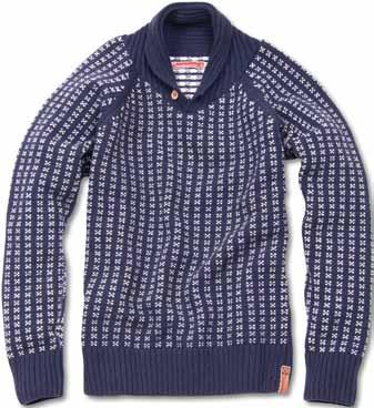 Danske Knowledgecotton Apparel anvender kun 100 % certificeret øko-bomuld fra marker, hvor råvarerne hovedsageligt håndplukkes. Virksomhedens vision er inden 2015 at spare miljøet for 150 tons kemikalier og pesticid er i forhold til en konventionel produktion. Kollektionen Happy Sheep er med uld fra får, der græsser på jorder uden vækstfremmende midler og som kun æder økologisk foder. Uglen i brandets logo er et symbol for naturlighed, ærlighed og tilgængelighed. Her ser du herrestrik, vejl. udsalgspris 1000 kr. Find mere info, fx om forhandlere, på www.knowledgecottonapparel.com.