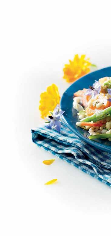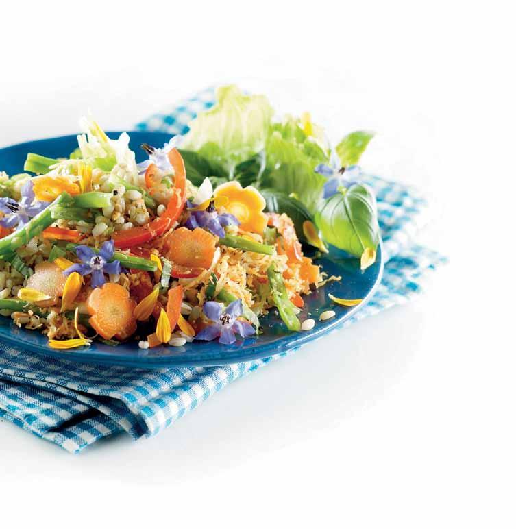 Kog perlebyggen som anvist på posen. Køl den af. De grønne bønner koges i letsaltet vand, til de er næsten al dente, cirka fem minutter. Alle grøntsager skæres i små tern. Miks det hele sammen i en stor skål, bland dressingen, og hæld den over salaten, som gerne må stå i nogle timer, inden du serverer den. Hvis du vil have en ekstra farverig salat, så pynt den med blå hjulkroneblomster og kronbladene fra gul morgenfrue. Du kan få en lidt lettere salat ud af bestræbelserne, hvis du blander den op med fintskåret icebergsalat.