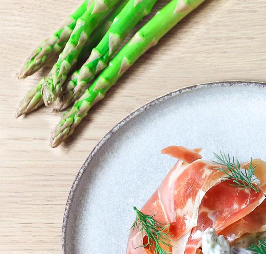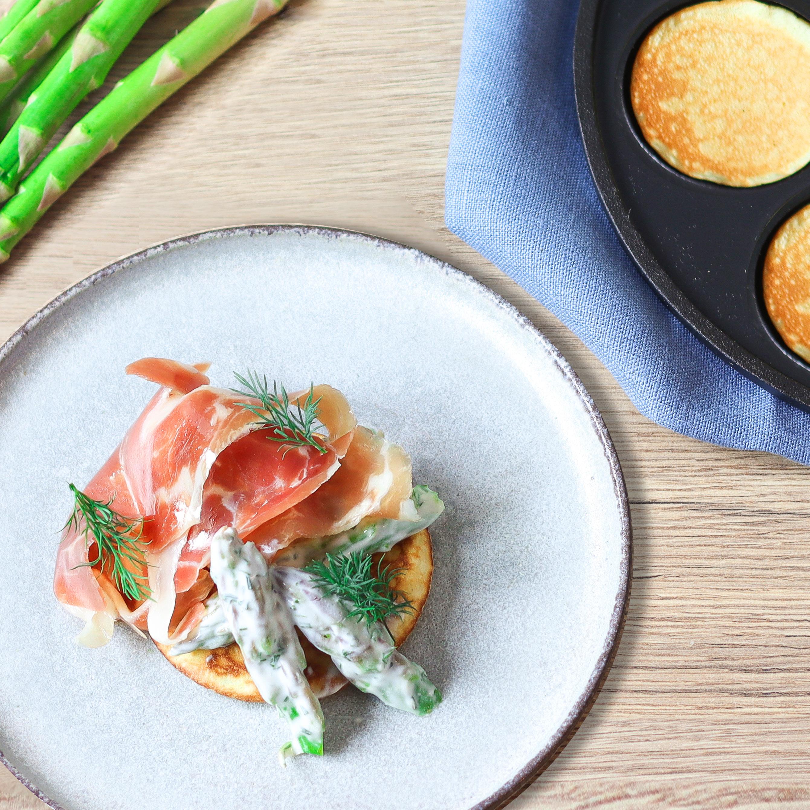 Server blinis med aspargessalat og god skinke.