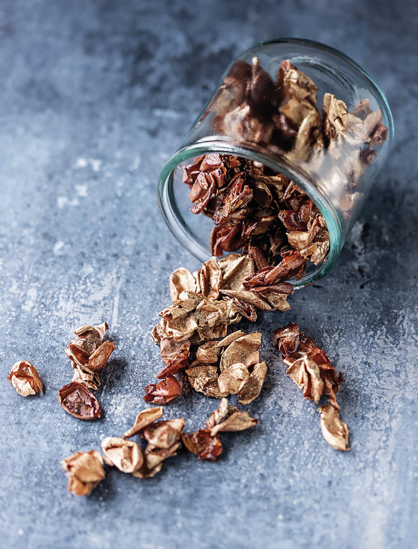 Sådan gør du: Kom alle ingredienser i en gryde, og kog det op. Lad skallerne koge 10 minutter i lagen. Tag mandelskallerne op med en hulske, og fordel dem på silikoneplader eller bagepapir. Tør dem i en dehydrator eller ovn på varmluft i to timer ved 40-50 grader. Tag skallerne ud, og dyp dem forsigtigt i lagen igen. Kom dem tilbage i dehydratoren eller ovnen i 4-6 timer, og lad dem tørre ved 40-50 grader, indtil de er knastørre.