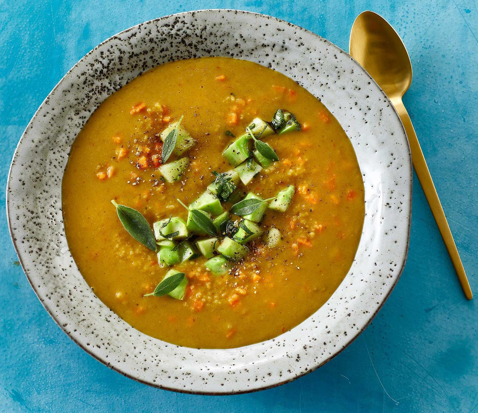 Steg løg, hvidløg og timian i olie til løgene får farve. Tilsæt selleri, gulerødder, tomatpure, tomat og tomatjuice og bring i kog. Tilsæt hvidkål, sellerisalt, quorn og linser og kog retten i 10 til 15 minutter. Tilsæt oregano, salvie og revet parmesan. Smag til med salt og peber.
