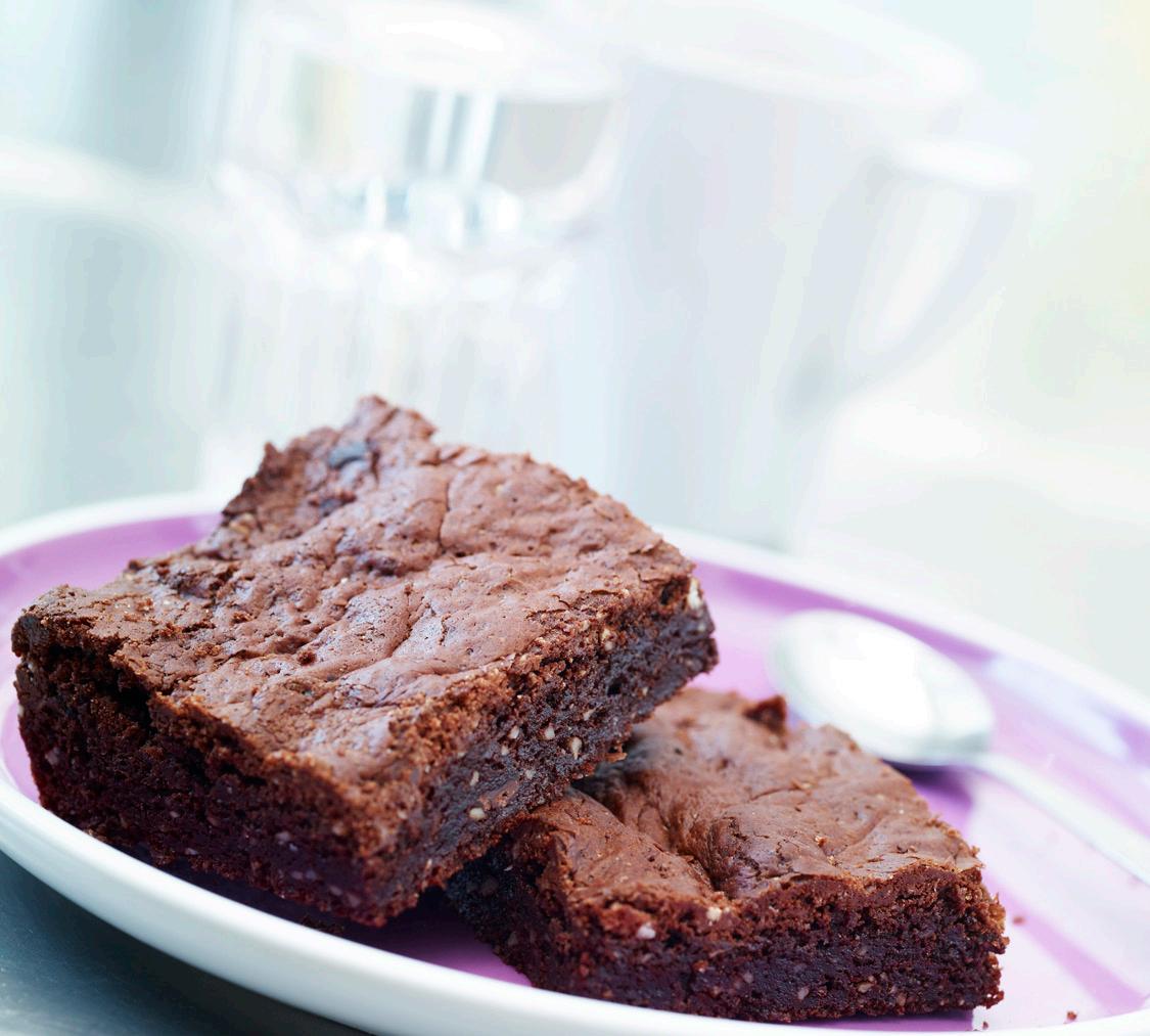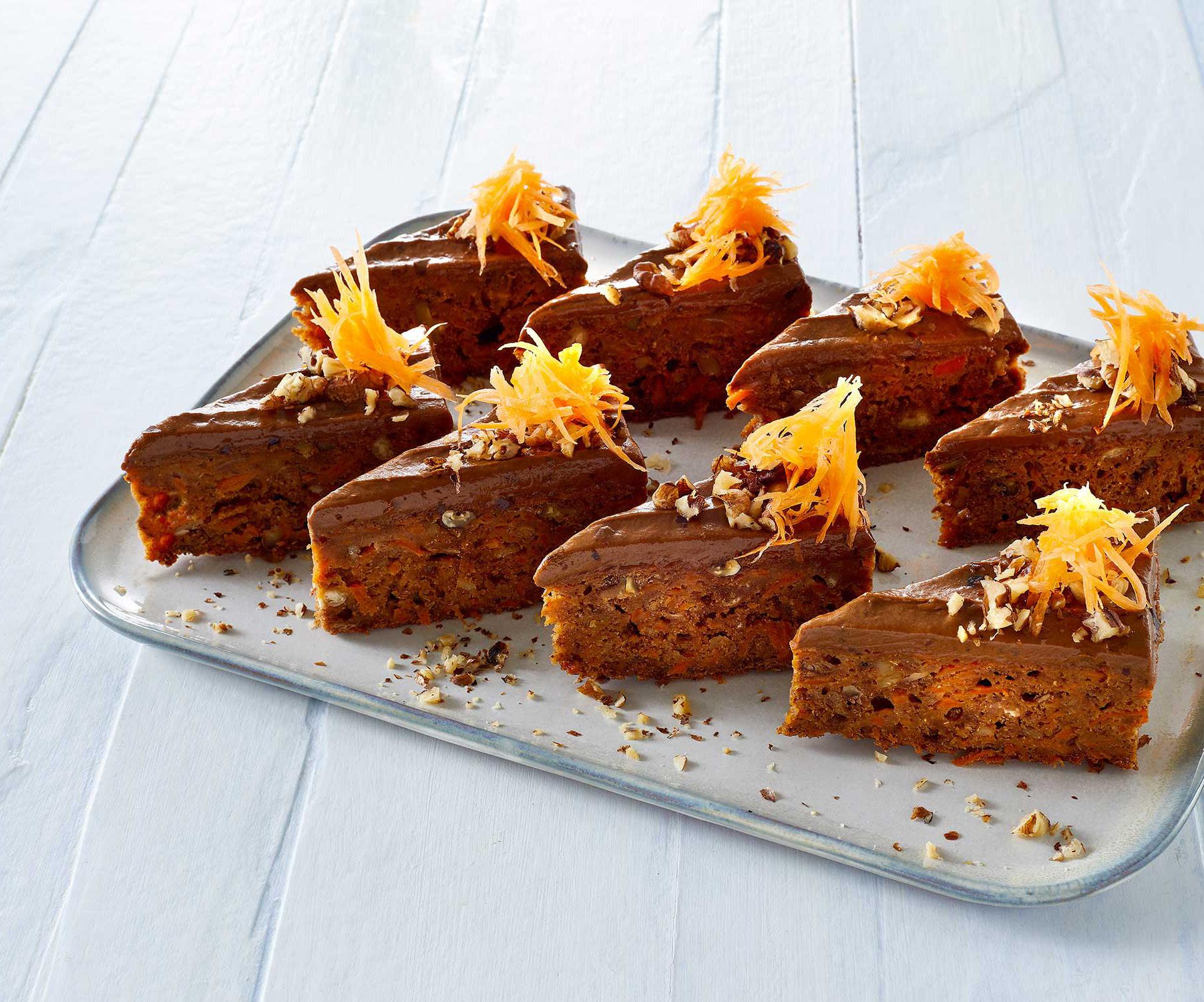 Bag kagen 20 til 25 minutter ved 180 grader. Afkøl den og skær den ud i små konfektstykker. Pynt evt. med valnødder, flødeostcreme, chokoladecreme eller lignende, men kagen smager fantastisk, som den er, og bliver kun bedre af at stå et par dage.
