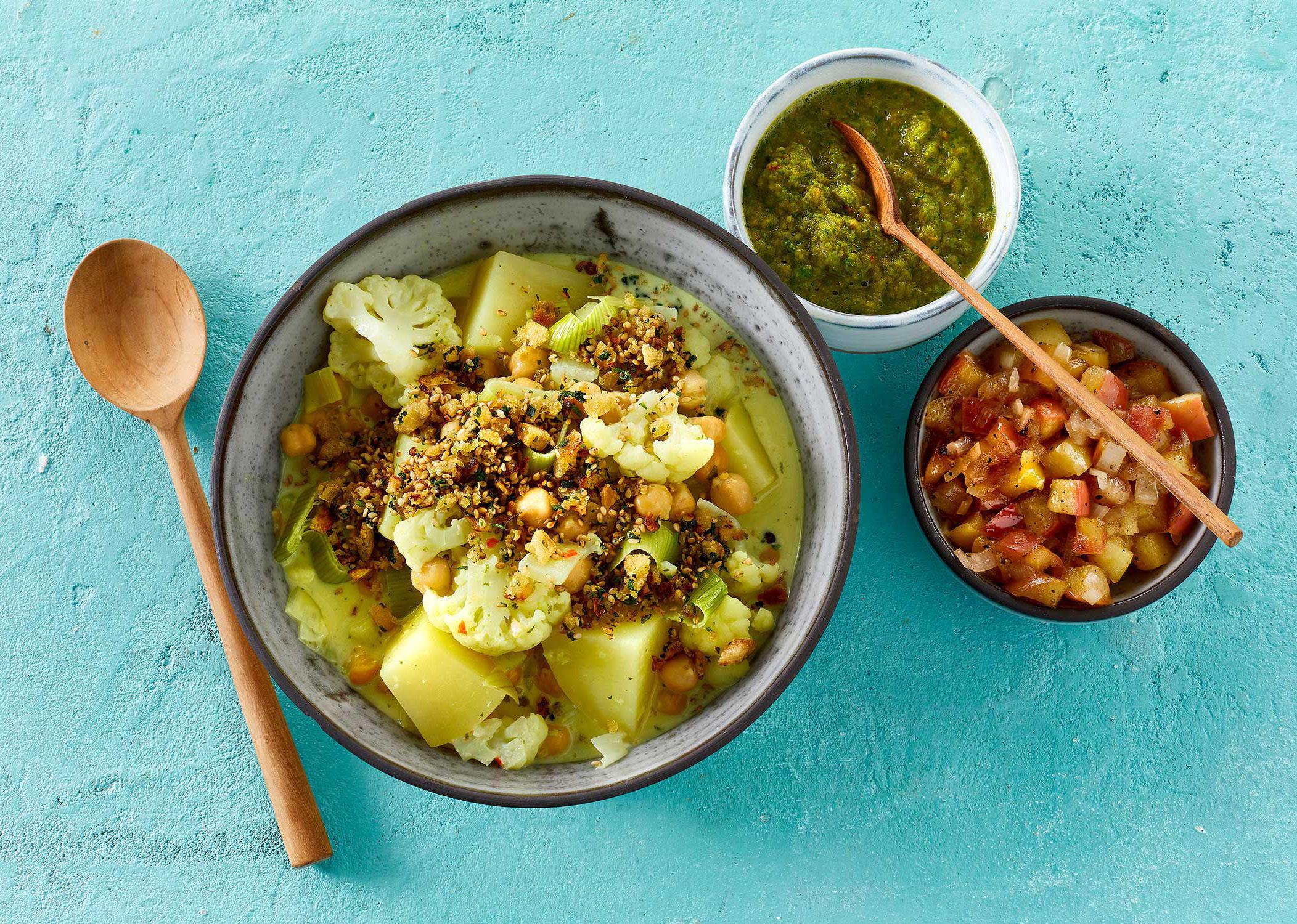Blomkål og kikærter i grøn karry med sprødt drys og æblechutmey.
