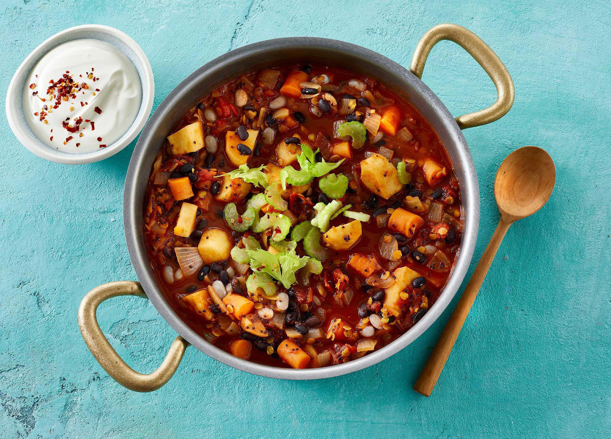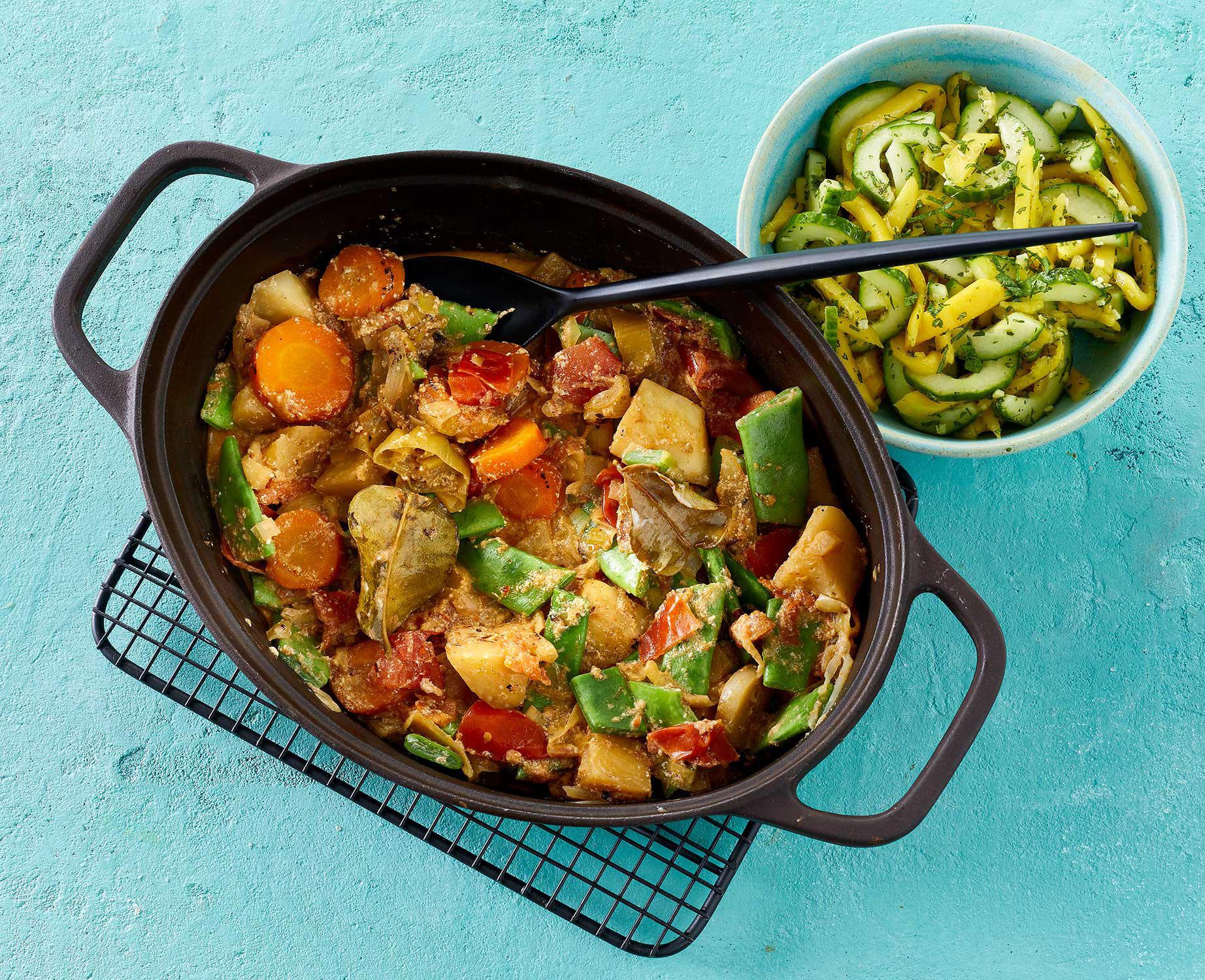 Mariner grøntsagerne med hvidløg, ingefær og krydderier mindst en time, gerne natten over. Brun grøntsagerne grundigt i varm olie i en stegegryde. Sørg for, at der bliver en god stegeskorpe, og at grøntsagerne ikke kommer til at ”koge” på panden. Stegningen rister krydderierne godt igennem og giver en rundere og mere fyldig smag til retten. Kom de brunede grøntsager i en stor gryde. Tilsæt tomater, vand, salt og peber. Lad retten simre en times tid, gerne uden låg, så sovsen bliver tyk og chunky. Tilsæt skyr, fløde og hestebønner og giv retten et hurtigt opkog. Smag til med salt og evt. flere krydderier. Retten må gerne tilberedes dagen før, så krydderierne kan trække ud i sovsen. Server med mangosalat.