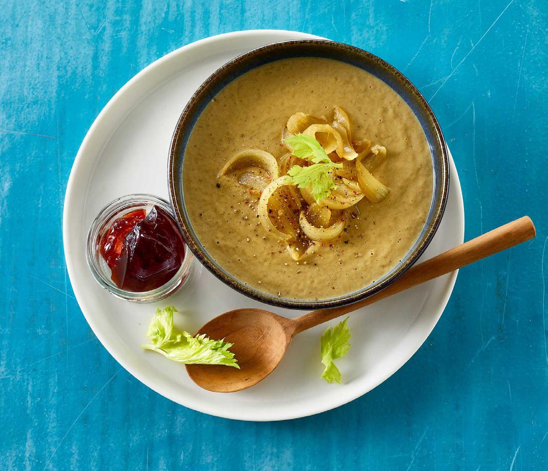 Kom løg, hvidløg, æbletern, ingefær og citronskal og -saft i en gryde sammen med rosiner, æbleeddike, sukker og salt. Kog det ved svag varme til det har fået en tyk konsistens. Tilsæt til sidst sennep efter smag og afkøl chutneyen. Server som dressing til varme retter eller smurt på ristet brød til en suppe.