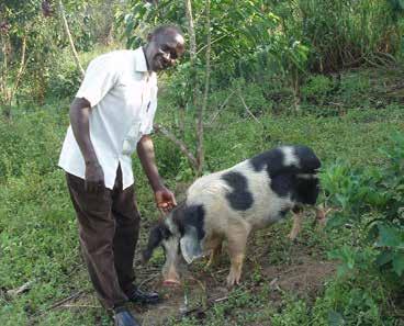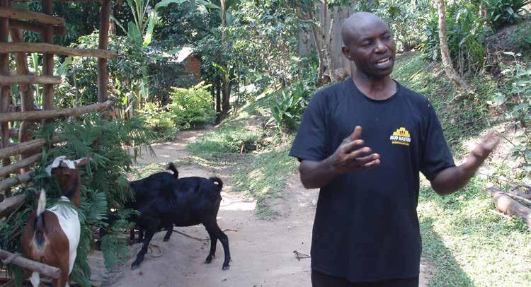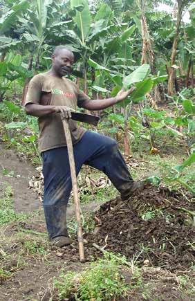 ØKOLOGI: SUNDHED, LOKALE PRODUKTER OG MARKED Mugisa og Oliver har deltaget i FFLG-arbejdet siden 2009 og mødte også hinanden igennem FFLG-aktiviteterne. Oliver er pt. kasserer i den FFLG, parret deltager i. Begge er enige om, at den bedste læring i FFLG-arbejdet har været samarbejdet i gruppen samt planlægning og håndtering af penge. I parrets FFLG praktiseres opsparing og lån på op til seks måneder. Derudover har parret lært sig at bruge en række økologiske teknikker såsom at etablere horisontale grøfter på skråningerne til opsamling af vand, bruge jorddække af blade og fremstille kompost af gødning blandet med husholdningsaffald, afskåret græs og blade fra kakaotræer og kaffebuske. De har arbejdet med at trimme buskene for at få størst udbytte af frugt frem for blade. Hvis der opstår sygdom på kakaotræerne, bruges biologisk bekæmpelse. Ifølge Mugisa og Oliver handler økologi om selv at fremstille afgrøder, dyrke grøntsager og styrke det sociale sammenhold omkring lokal produktion. I 2007 stod en politimand i spidsen for en kampagne til fordel for brug af DDT, fordi der var græshopper, som spiste majsen. I lokalsamfundet stod alle dog sammen og protesterede. Siden da er der primært blevet dyrket økologisk i distriktet. At dyrke konventionelt ville være at gå på kompromis med sundhed og markedsfordele, siger Mugisa, og det ønsker han ikke.