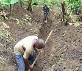 var der to faste regntider april-maj og oktober-november, men i Kabarole regnede det i 2019 dagligt juni-oktober. Det er et stort og vigtigt arbejde at grave og vedligeholde horisontale grøfter for at fastholde regnvand og modvirke jordskred. Desuden tilplantes med elefantgræs f.eks. langs med stierne for at holde på jorden. Der produceres kompost af gødning fra geder og høns, græs og blade til fordeling under kaffeplanterne for at styrke jorden. Bananblade bruges som foder, jorddække og -forbedring.