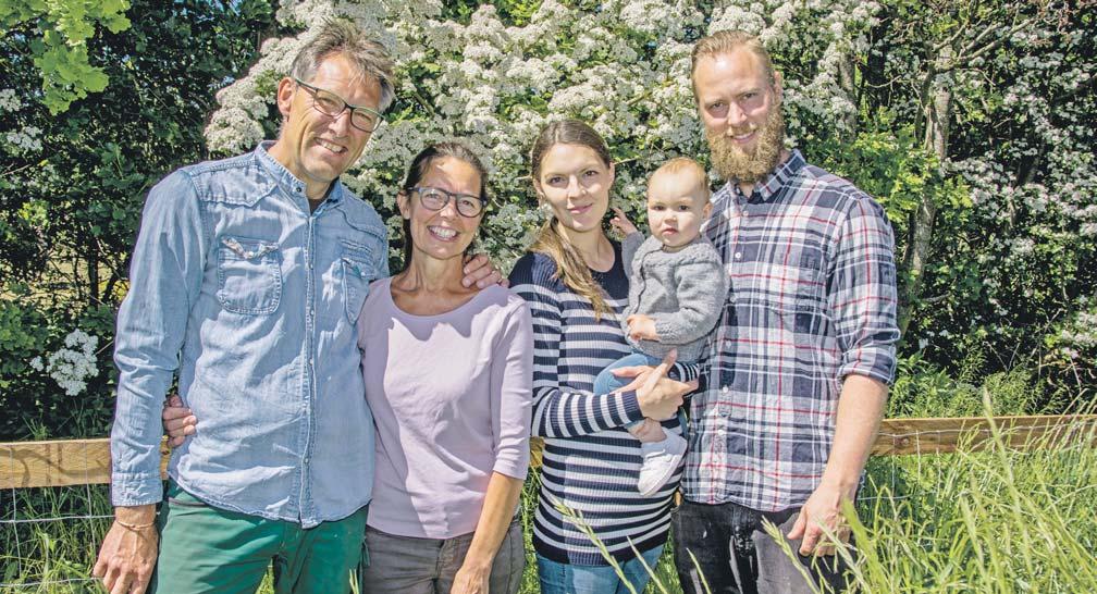 Hele familien er involveret i arbejdet med at etablere et multifunktionelt landbrug på Topkærgaard. Fra venstre Kim og Lene Qvist, Sille, Clara og Anders Quist Duus. Foto: Morten Telling
