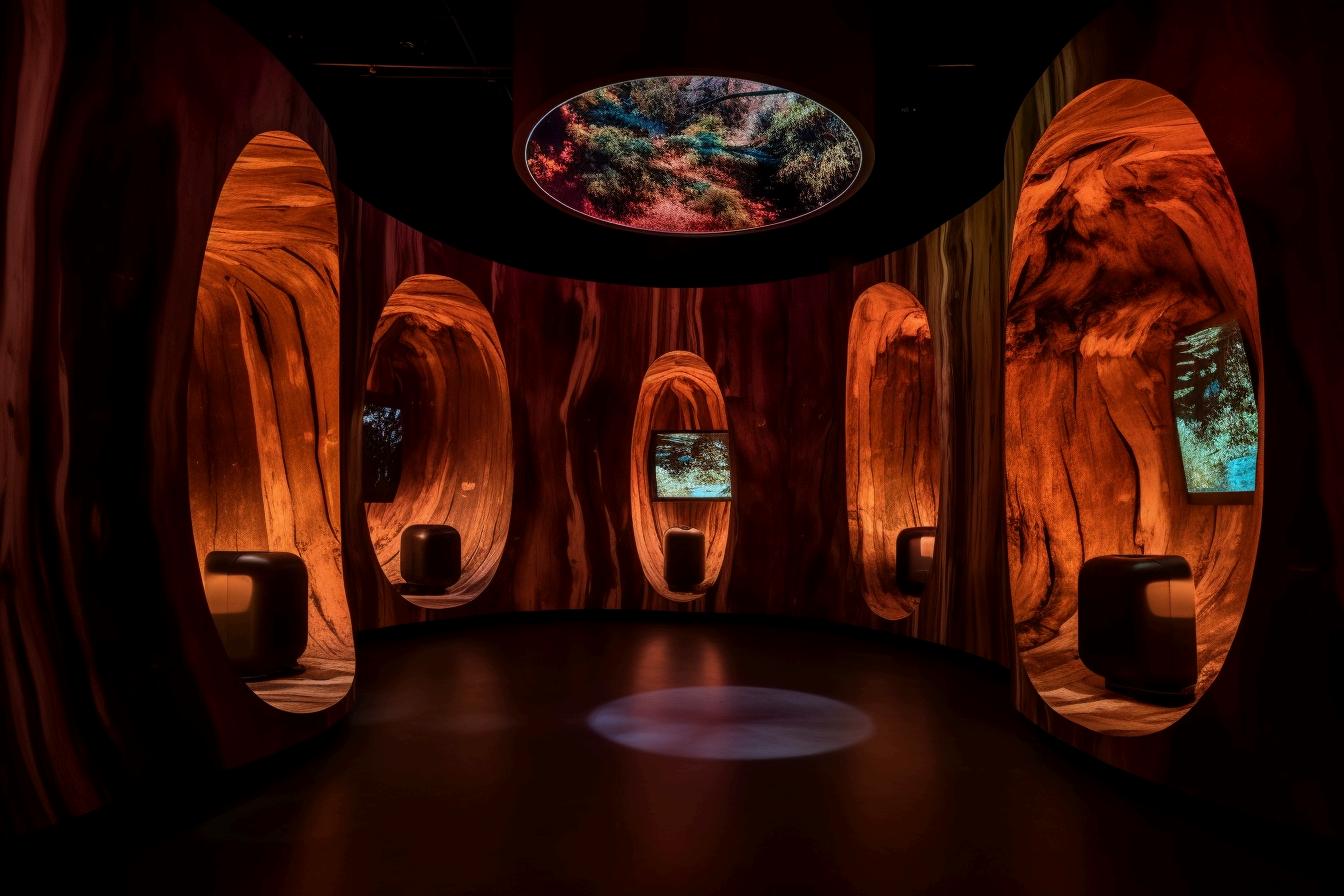 The Grove is the central and largest area of the floor and commands a sense of reverence and respect. Separated visually from the surrounding glowing wildwoods, The Grove resembles an ancient wooded area, unveiling the majority of our instrument collection along with fascinating stories about various Okie musicians. Visitors can hear the instruments through their RIPLEY app, collect songs from our artists, and learn more about the craftwork of musicians.
