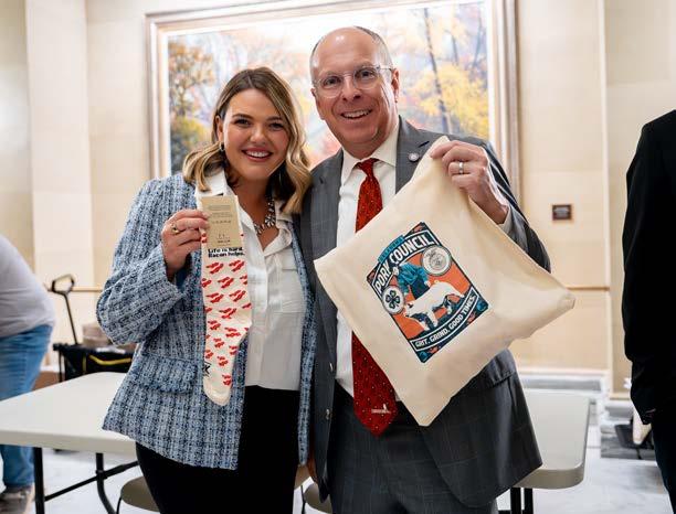 Building on the continued success of our build-yourown pork charcuterie station, this year the Oklahoma Pork Council worked with a new charcuterie vendor called “SAVOR OKC” to offer a jaw-dropping selection of bacon on a stick, ham, prosciutto, salami, chicharrones, a variety of other pork products, cheese, fruits and sweets. In total, Oklahoma Pork’s crowd-favorite booth distributed more than 300 pork-focused snacks to legislators, staff, and Capitol visitors. Additionally, we distributed more than 1,000 Oklahoma Pork giveaways like “The Year of Youth in Ag” tote bags, “Life is hard. Bacon helps.” socks, stickers, squishy pigs, and more.