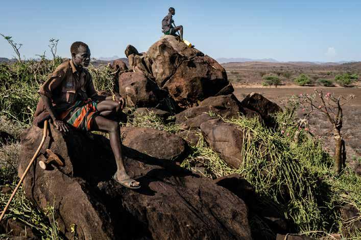 Turkana, Kenia. In een afgelegen streek in het noorden van Kenia zitten nomaden op de ‘Slangenberg’, een heuvel vol groene gevaarlijke slangen. Ze kijken uren naar hun schapen die op zoek zijn naar wat schamele blaadjes en keuvelen de tijd door. De Turkana leven in één van de regio’s ter wereld die het snelst opwarmen door de uitstoot van CO2, terwijl ze zelf nauwelijks bijdragen aan die uitstoot.