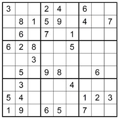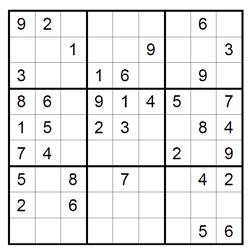 Vul de sudoku in door in elk blokje een cijfer van 1 tot en met 9 te schrijven. Let op: in elke rij, kolom en 3x3blok mag elk cijfer maar één keer voorkomen!