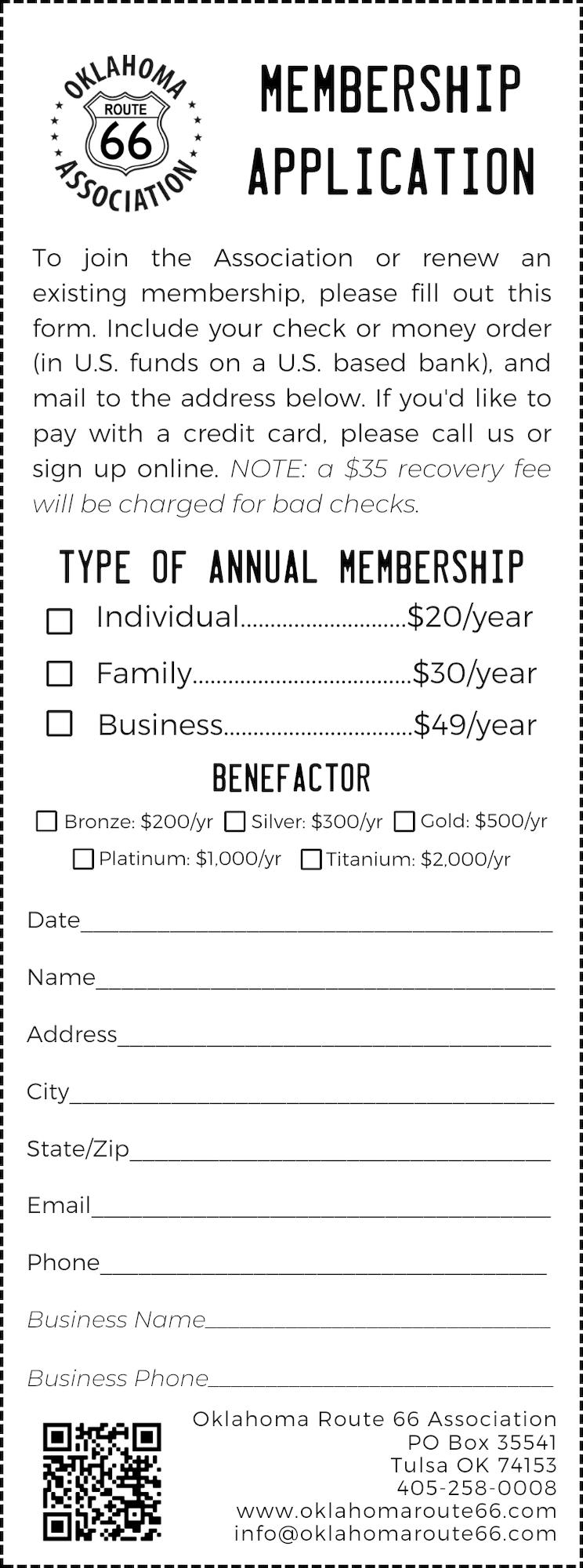 We want to continue serving Oklahoma’s 400+ miles of Route 66 far into the future. If you find value in this Trip Guide and want to be a part of our journey, join the Oklahoma Route 66 Association today! You can join via our website, by calling us, or by sending us a check in the mail. Check out the Membership Application on Page 52 for more information.