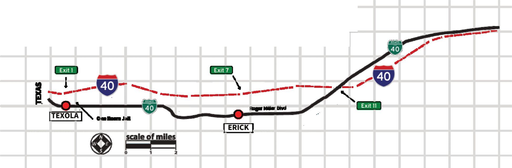 Business 40 will take you through the towns of Elk City, Sayre, and Erick. Parts of the open road between these communities are also signed Business 40. The rest of it may or may not have county numbers. Don’t follow Business 40 blindly, however, as it loops back into I-40.
