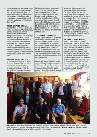 Plymouth and then at Warwick School where he also qualified as a Squash, Hockey and Basketball coach. He moved subsequently to Birmingham and now lives in Leeds where he continues to coach and play squash and is the lead singer of “The Johnny Gray Band”. ROGER KENNEDY (GR) went to Oxford where he played occasionally for the Greyhounds. After graduating, he went to South Africa where he was part of the team which designed and built the port container terminals at Cape Town, Durban and Port Elizabeth. On returning to the UK he became a management consultant, working for a number of large accountancy firms and spent many years working on the redesign of the London Congestion Charging Scheme. He climbed Mount Kilimanjaro with one of his sons in 2014. RICHARD MUNNS (MO) went to Nottingham University to read Chemical Engineering. He worked for a control instrumentation company in the petrochemical industry in Tunbridge Wells and was given five weeks to learn Italian