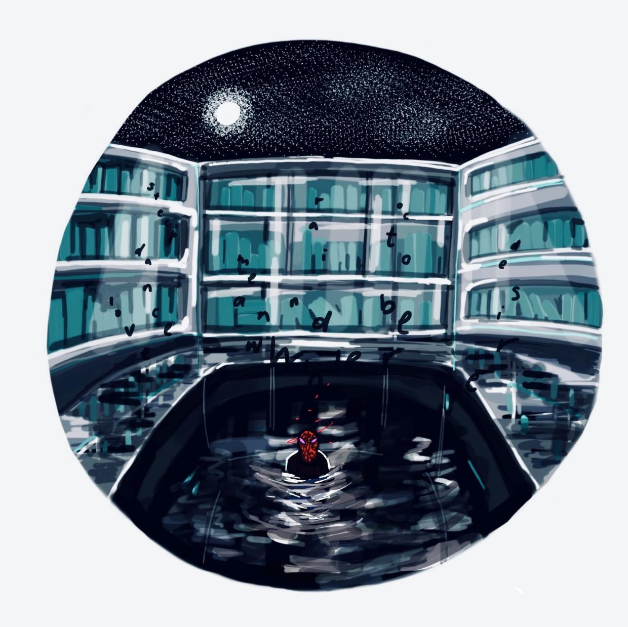 The next morning, she went straight to the library. Using one of the kitchen utensils she prised open the box and felt herself blown backwards by a gust of wind and a bright white light. The library seemed to fold in on itself and she was in a black pool of warm water surrounded by the glass cases. From them she saw words spilling into the water like rain drops. Above all of this she saw a figure moving towards her across the water. The words surged up over the figure’s skin, swirling and gliding across their flesh in currents. Sál moved backwards against the edge of the pool. The figure was close now, so close that she could just make out a hint of purple in their eyes. Gently their hand caressed her face and as it did, she sank down into the water so that she was fully submerged.