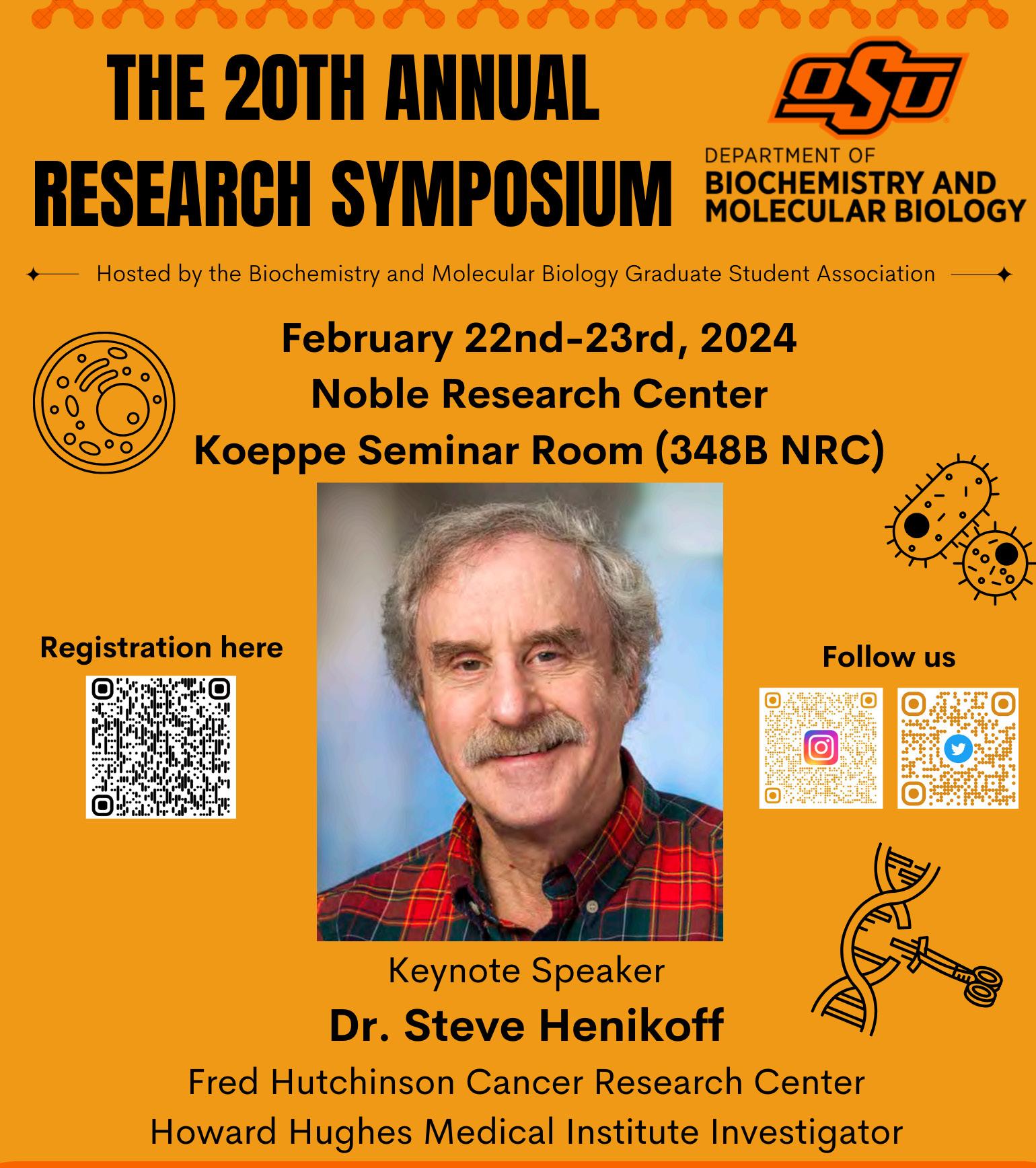 The department would like to give a special thanks to our keynote speaker, US National Academy of Sciences Member, Howard Hughes Medical Institute Investigator and Professor, Steve Henikoff from the Fred Hutch Cancer Center who provided a lecture entitled, “Genome-wide mapping of chromatin dynamic in-situ”. We recognize the Division of Agricultural Sciences & Natural Resources, Department of Veterinary Medicine, Department of Biochemistry and Molecular Biology, the Robert M. Kerr Food and Agricultural Products Center, Department of Plant Biology, Ecology, and Evolution and College of Health Sciences for providing the funds that supported the symposium.